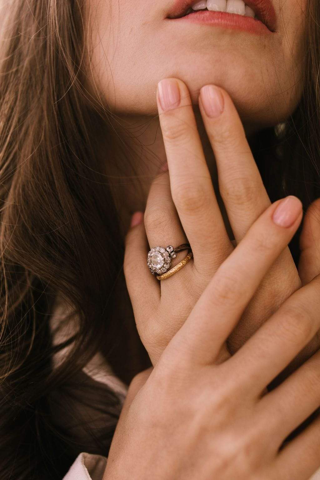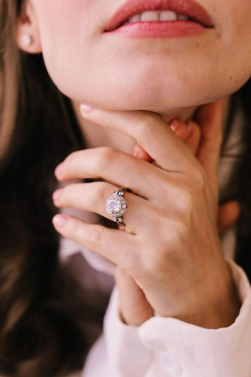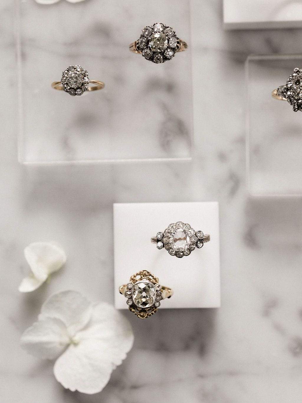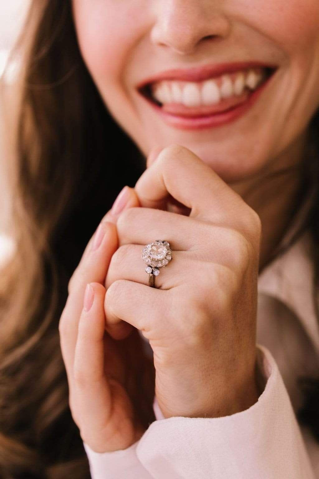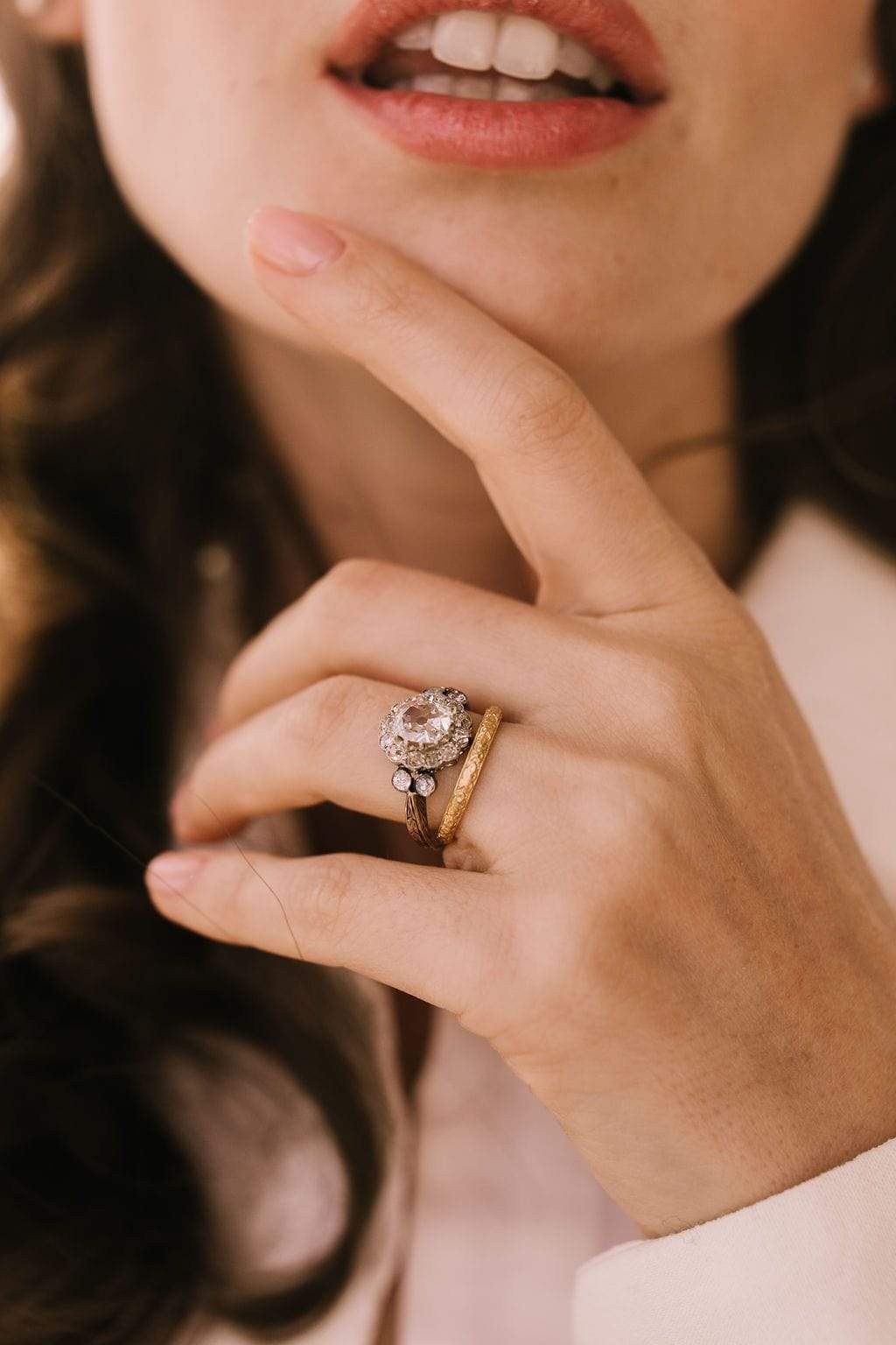 One of the best cluster rings to date! A super unique diamond centers the ring (a rare flat old mine cut which is a shape we are in love with for its uniqueness and very cool shimmer) with the cutest old mine cut halo! The ring is super low profile and has such a big look that takes up some real estate!