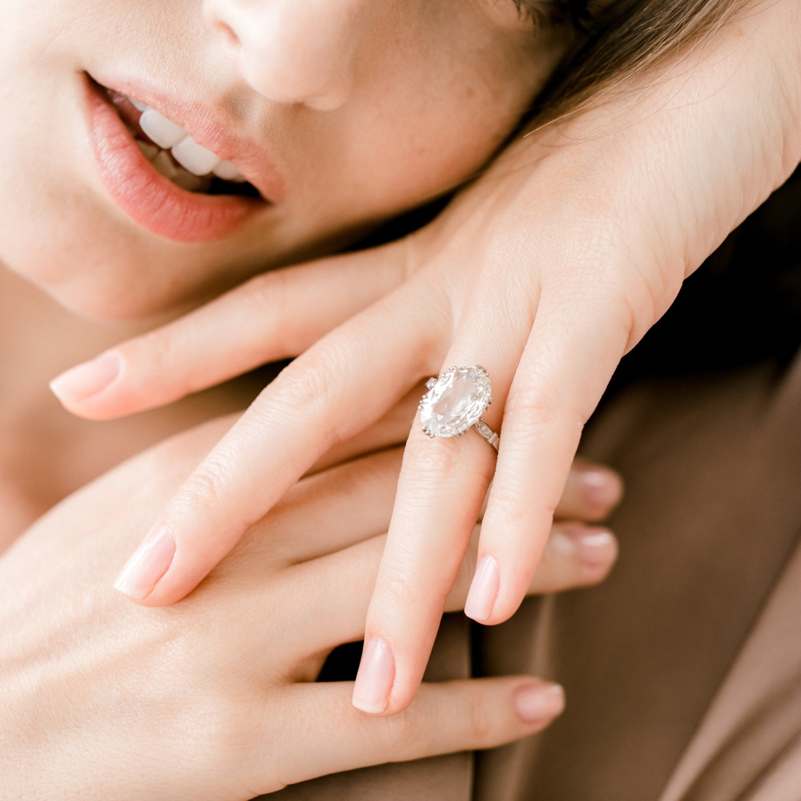 The Portia Ring is an antique oval diamond engagement ring from the Edwardian Era, circa 1915! This amazing ring centers a GIA Certified 3.75 carat Antique Oval diamond of J color, VS2 clarity. The diamond is set in a platinum 6 triple prong setting with three diamonds to each side set in a leaf-like shape. The shank has gentle fluting detail. The ring is size 7.25 and can be resized!