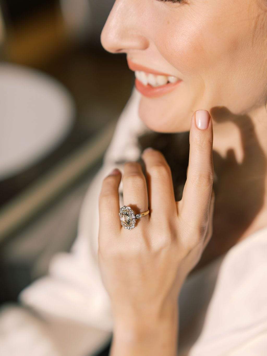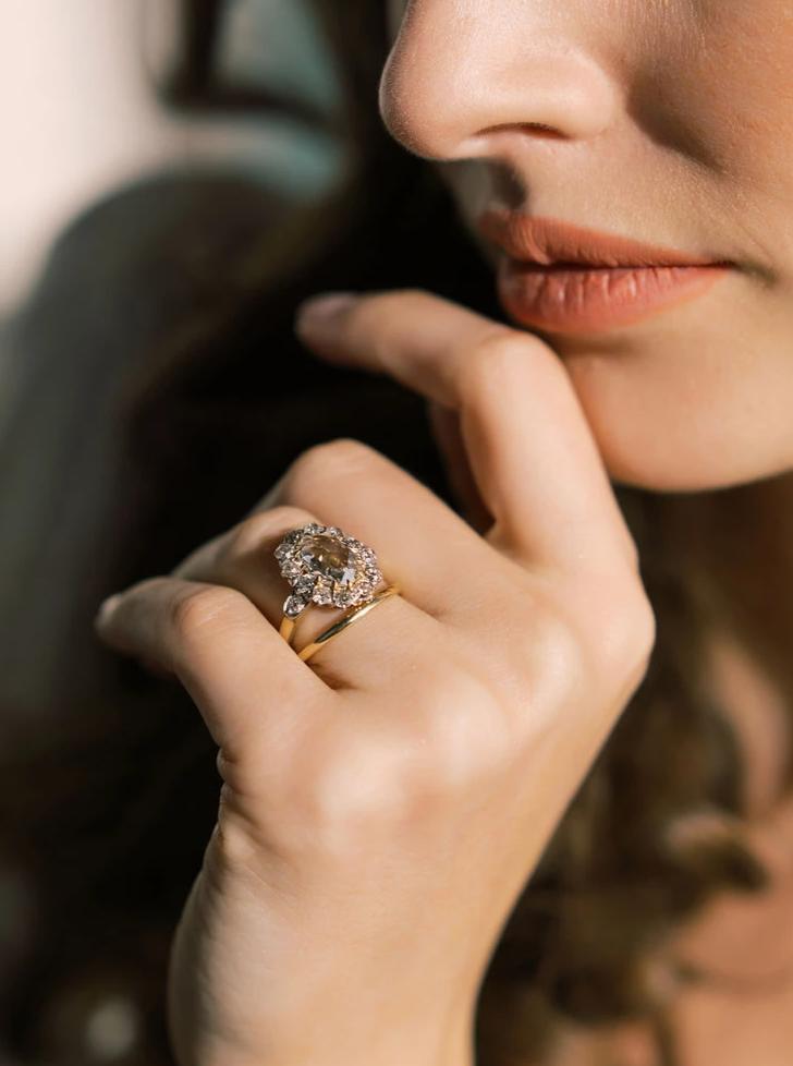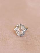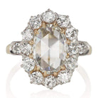 The Esamae ring is a vintage diamond engagement ring from the Edwardian Era circa 1905. The ring centers a GIA certified 2.05-carat Oval Rose cut diamond of K color, VVS2 clarity. The stone is set in a platinum-topped 18-karat yellow gold setting and is surrounded by a halo of 12 old European cut diamonds with an additional one on each shoulder. The side diamonds all combine for approximately 0.90 carats. The ring is currently size 5.75 and can be resized!