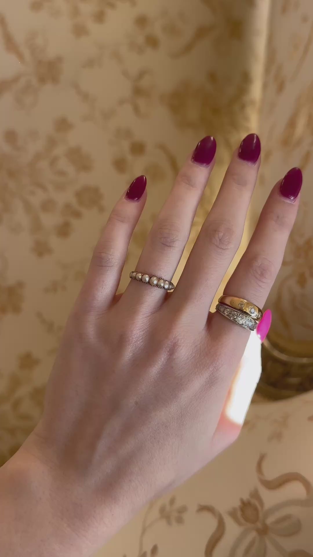 The Luna ring is an authentic antique pearl ring from the Edwardian Era circa 1900. The antique half hoop ring centers 9 Pearls. The stones are set in a 10kt Gold cut down setting. The ring is currently a size 5 and can be resized!