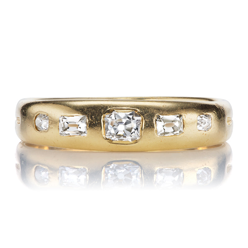 The Winona ring is an authentic antique diamond ring from the Victorian Era circa 1850. The ring features five Peruzzi cut diamonds of J-K color, VS clarity. The stones combine for an approximate total of 0.50 carats. The stones are set in an 18kt Yellow Gold gypsy band setting. The ring is currently size 8.75 and can be resized!