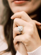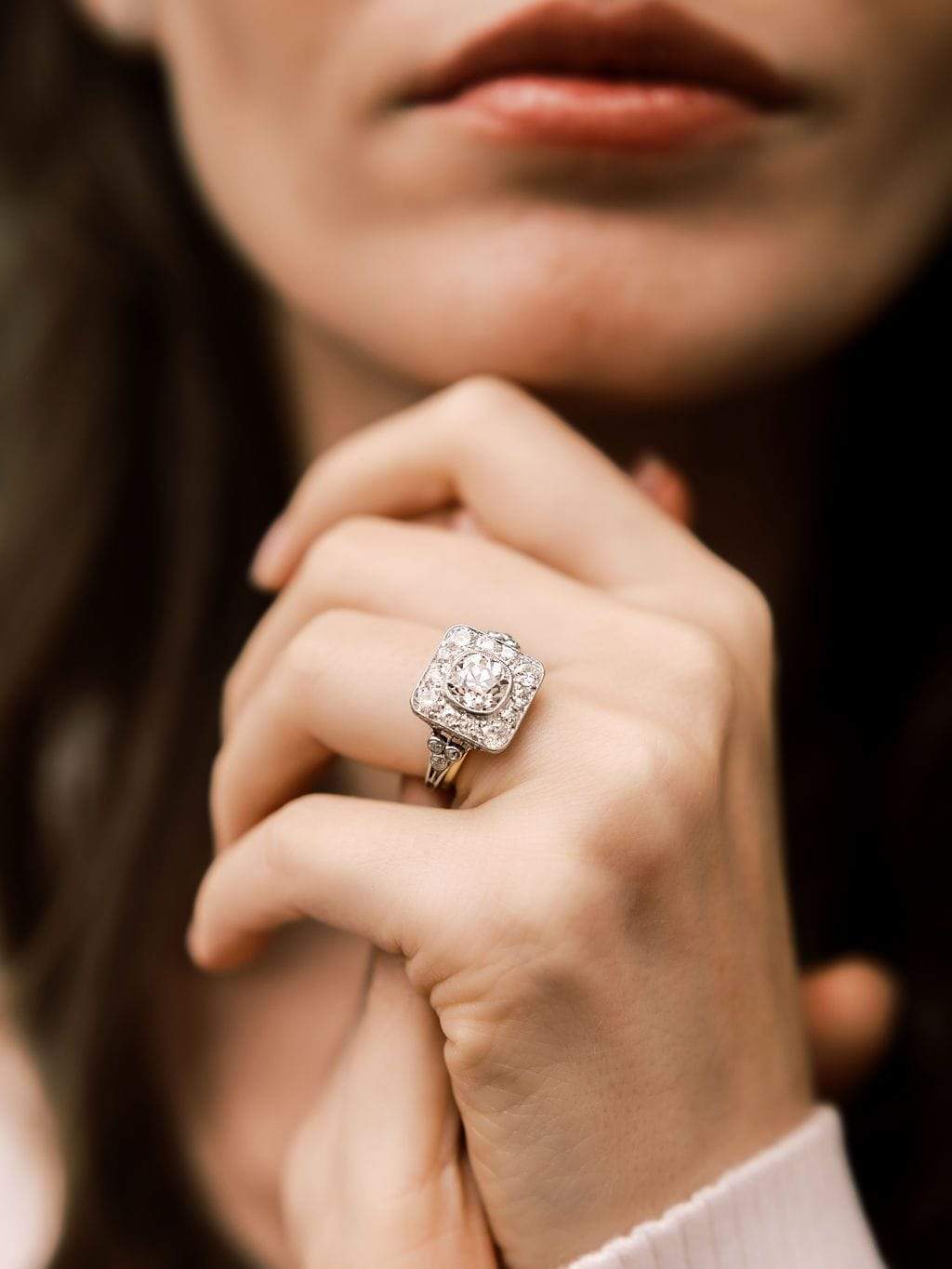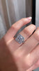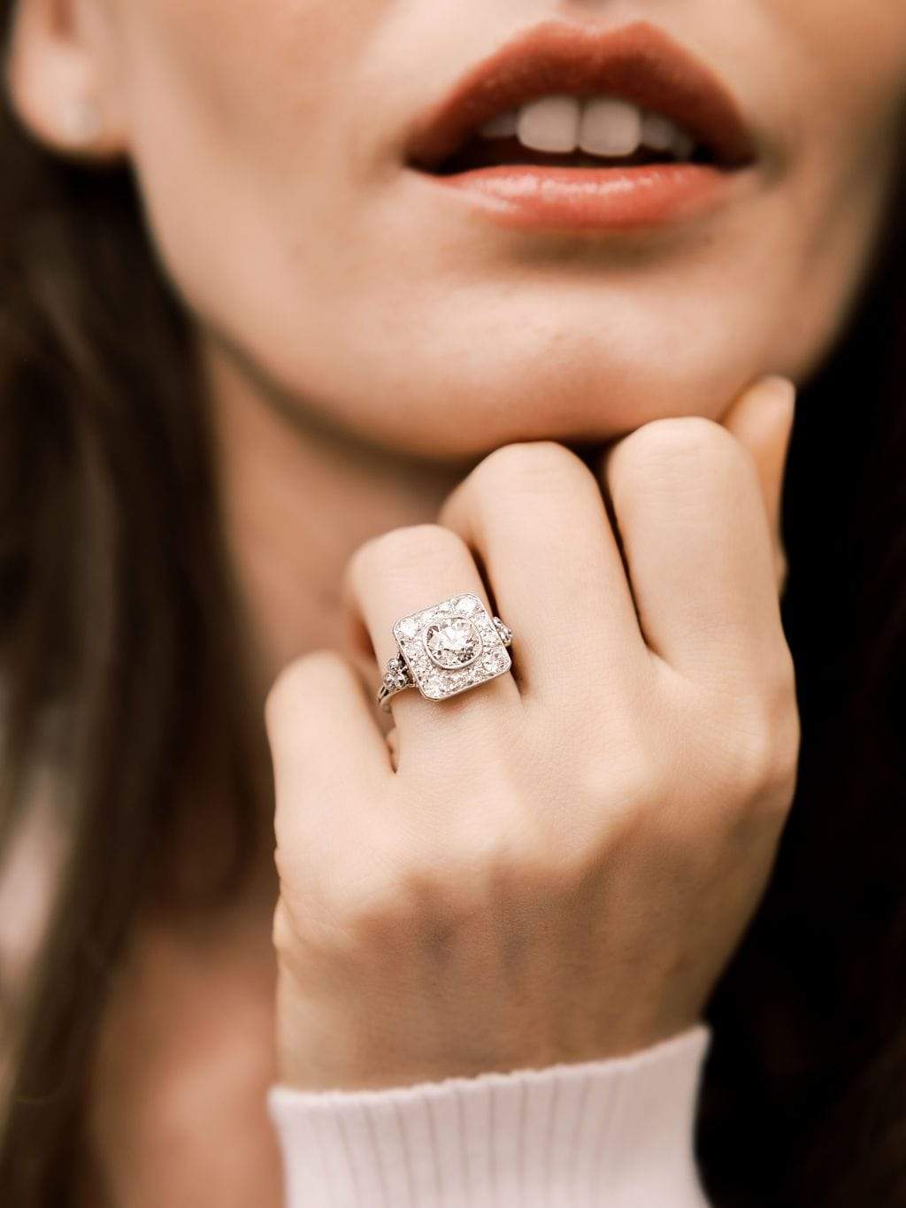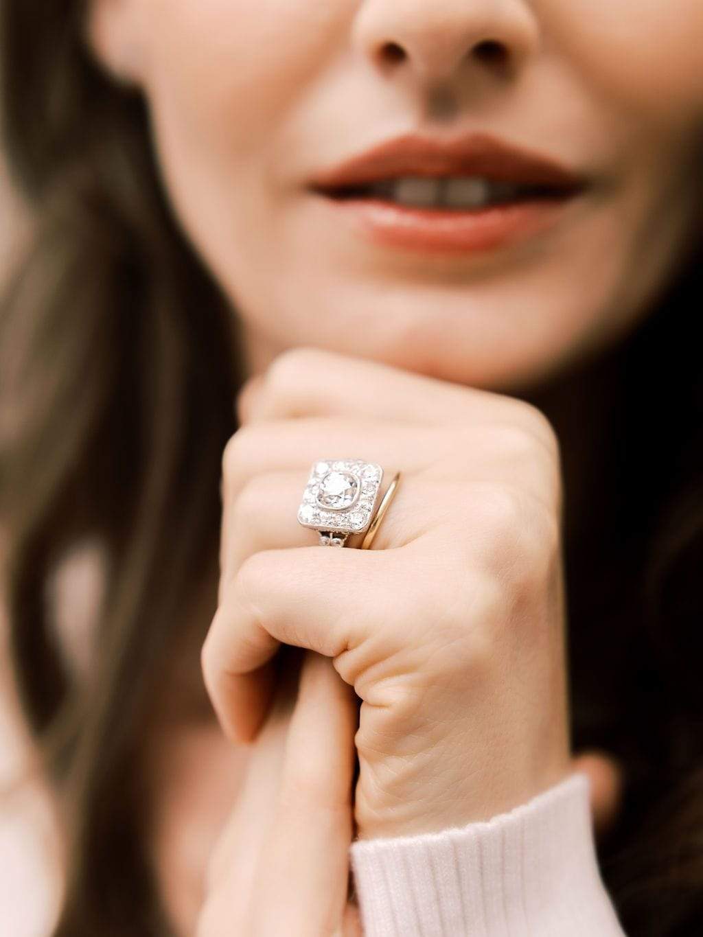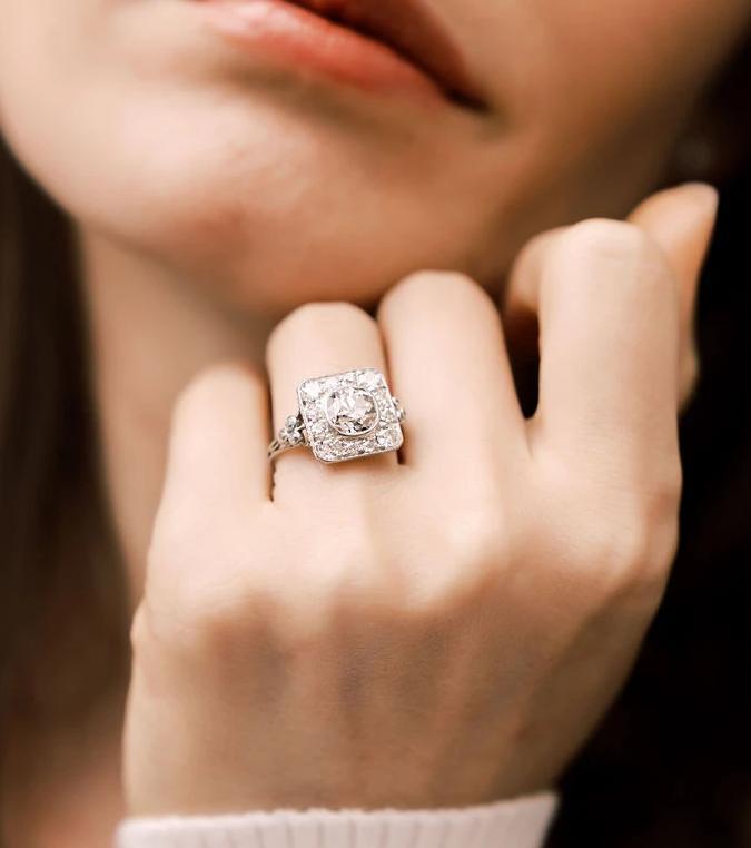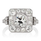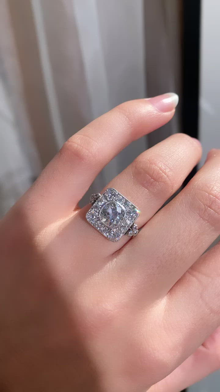 The Sadie ring is an antique square halo engagement ring from the Edwardian era. The ring centers a GIA certified 1.60-carat old mine cut diamond of H color, VS2 clarity. The diamond is bezel-set in a platinum ring with 12 old European cut diamonds bead-set on the face and combine for approximately 0.58 carats. The ring is currently size 6.25 and can be resized!