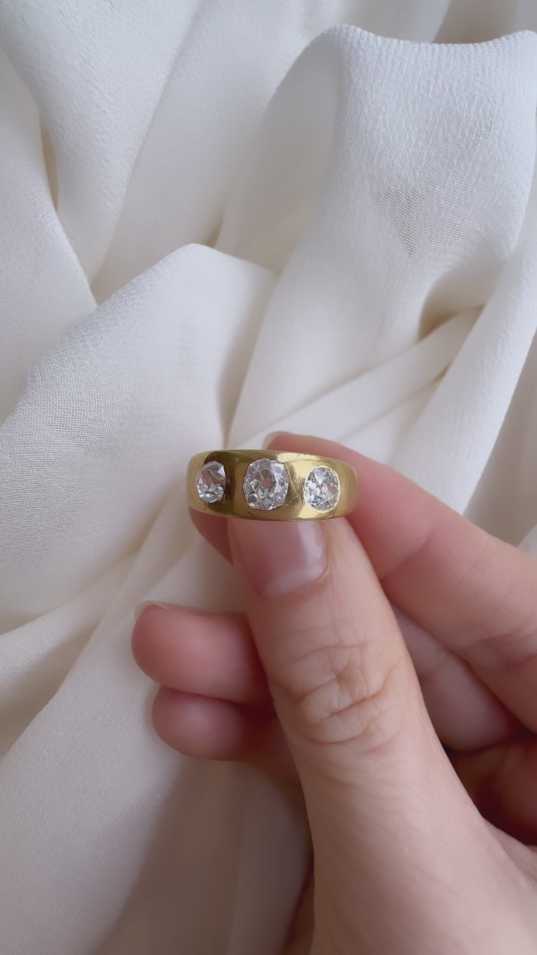 Full of character and personality, this gypsy ring features three charming antique diamonds set in this low, flat, finger-hugging dream. A unique engagement ring or the perfect right-hand ring to add to your collection!