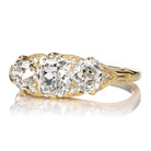 The Verena ring is an authentic vintage ring from the Victorian Era circa 1890. The ring features 3 Old Mine Cut diamonds set in scrolling, glowing 18kt Yellow Gold. The three diamonds combine for approximately 1.45 carats of approximately O-P color, VS-SI clarity. An additional 6 Rose Cut diamonds are set between the three main diamonds. The stones are set in an 18kt yellow gold setting with beautiful, intricate engravings in the gallery and shoulders. The ring is currently size 4.5 and can be resized!