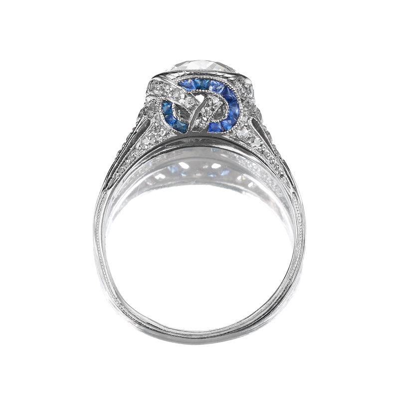 The details on this antique beauty are just superb. We love the unique knotted pattern of diamonds and sapphires that adorn the side profile of this ring. The most delicate millegrain dots the bezel setting. And can we talk about this incredible old Euro? High specs and entrancing facets have us falling in love over and over again with this diamond.