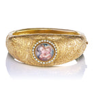 The Rhea bracelet is an authentic antique bangle from the Victorian era circa 1880. The bangle features a delicate painting outlined by pearls. Stunning floral engravings are detailed throughout the 18kt Yellow Gold bangle.