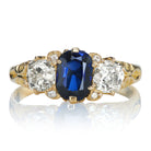 The Jacky ring is an authentic antique sapphire and diamond engagement ring from the late Victorian Era. The ring centers a GIA certified Oval No-Heat Sri Lanka sapphire of approximately 1.00-carats. The stone is set in an 18kt yellow gold setting with an old mine cut diamond set to each side of the sapphire, each approximately 0.25 carats, with 4 tiny rose cut diamonds are set between each of the stones. The side stones are approximately N-O-P color, VS-SI clarity. The ring is currently size 5.75 and can be resized!