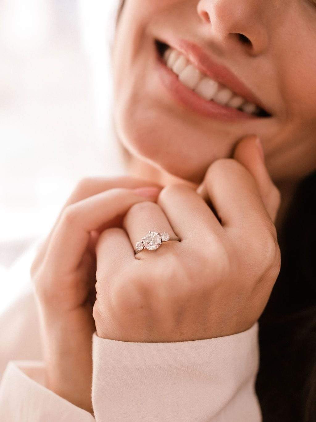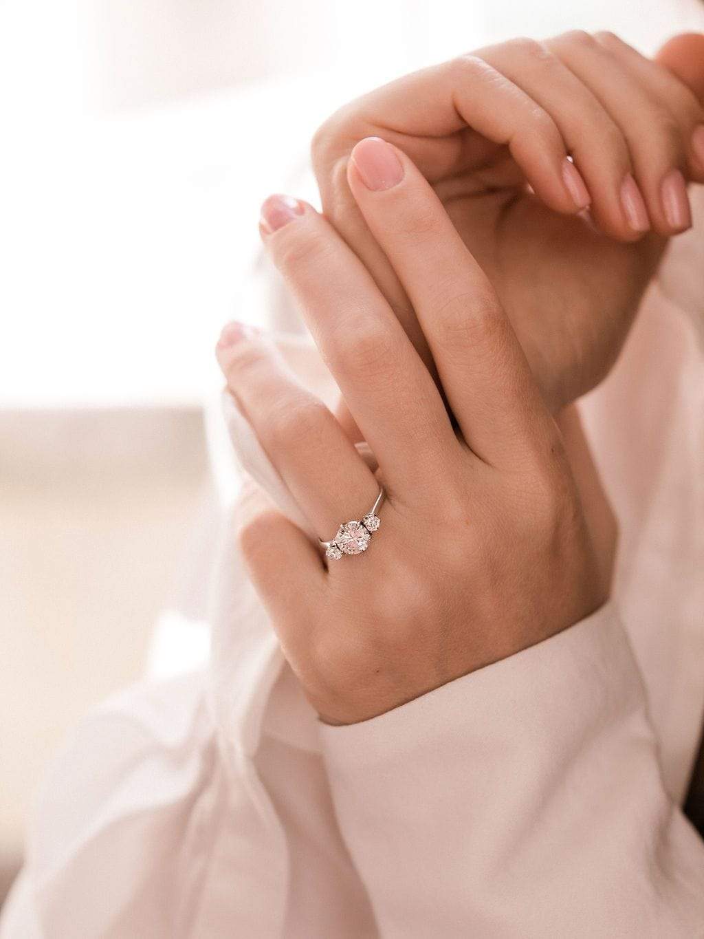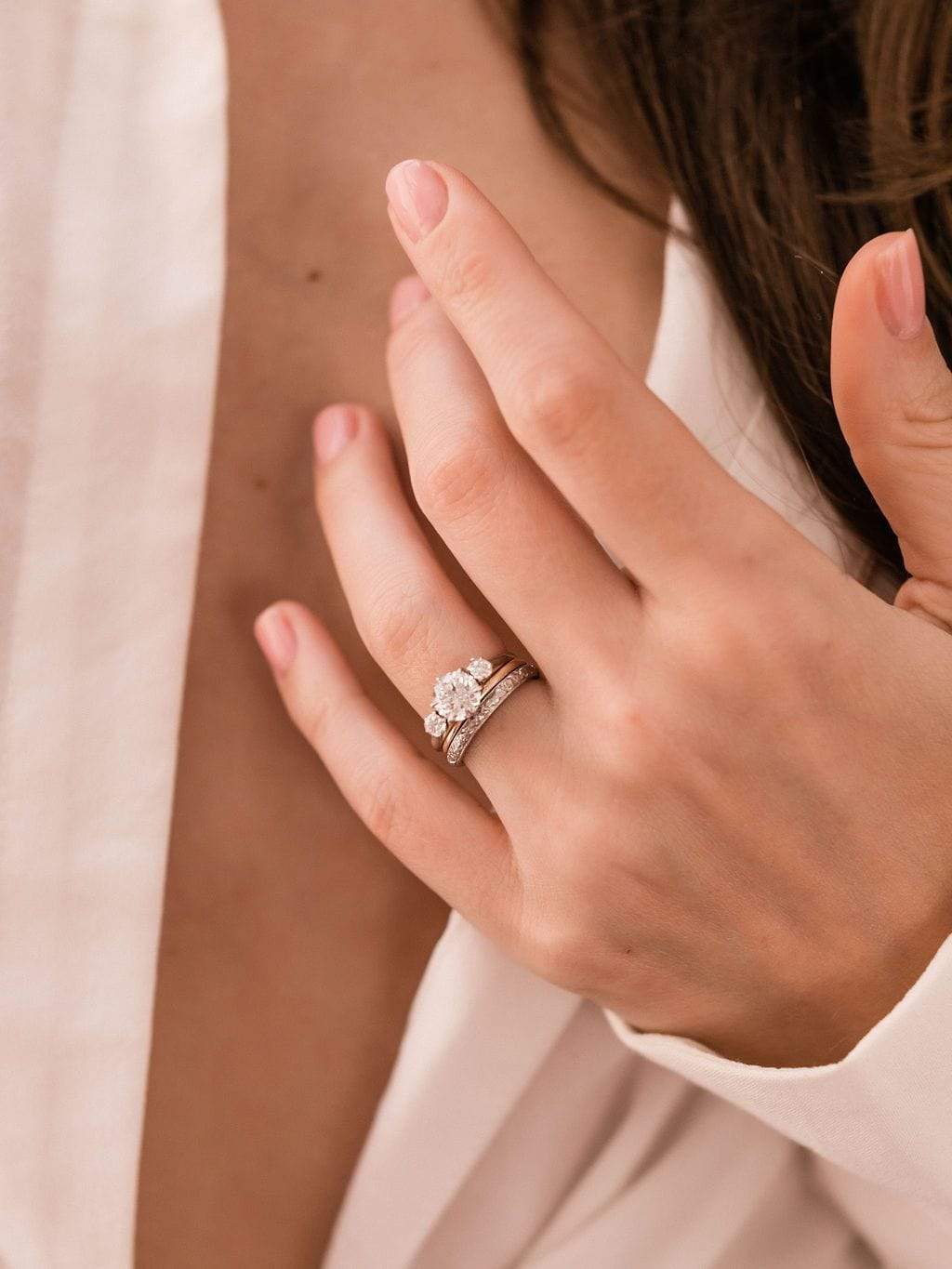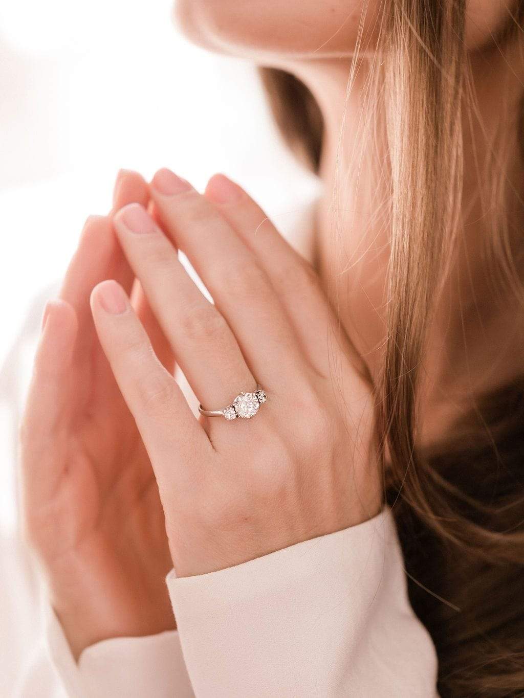 Nico the perfect delicate platinum three stone ring. It is so minimal and dainty with a chunky bright center diamond. This ring is also great to stack with!