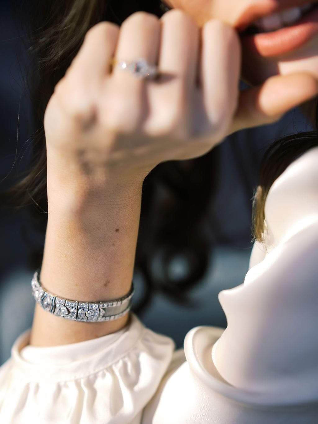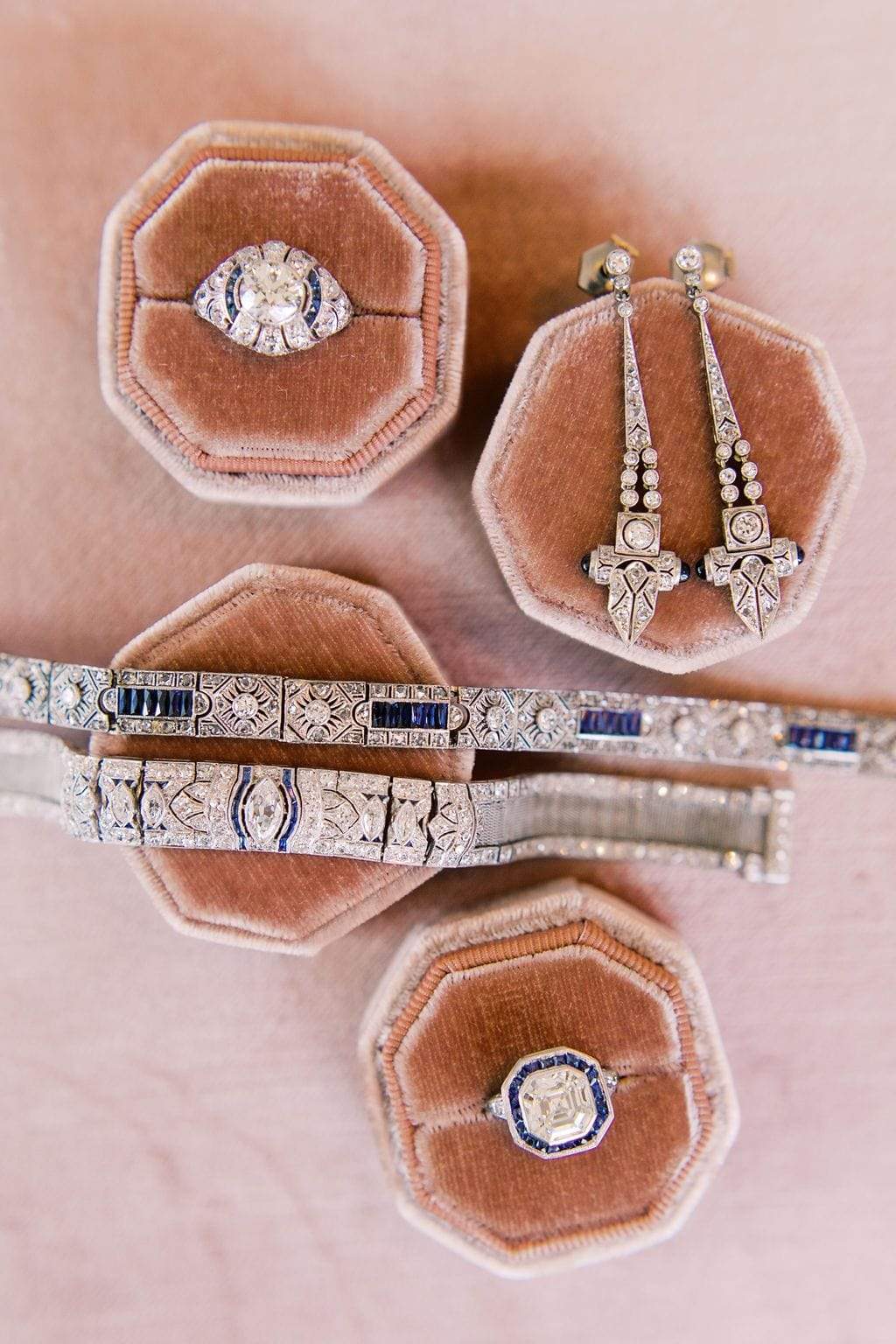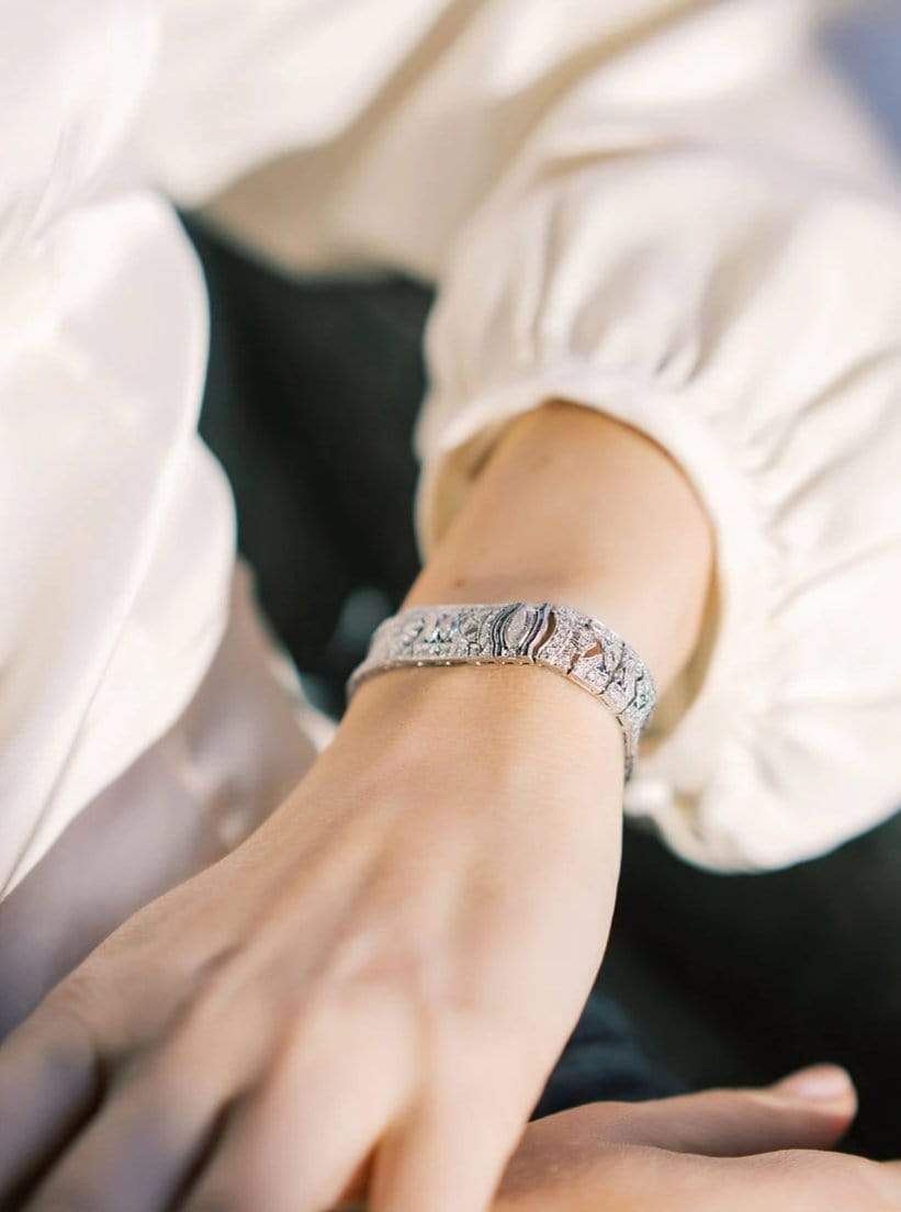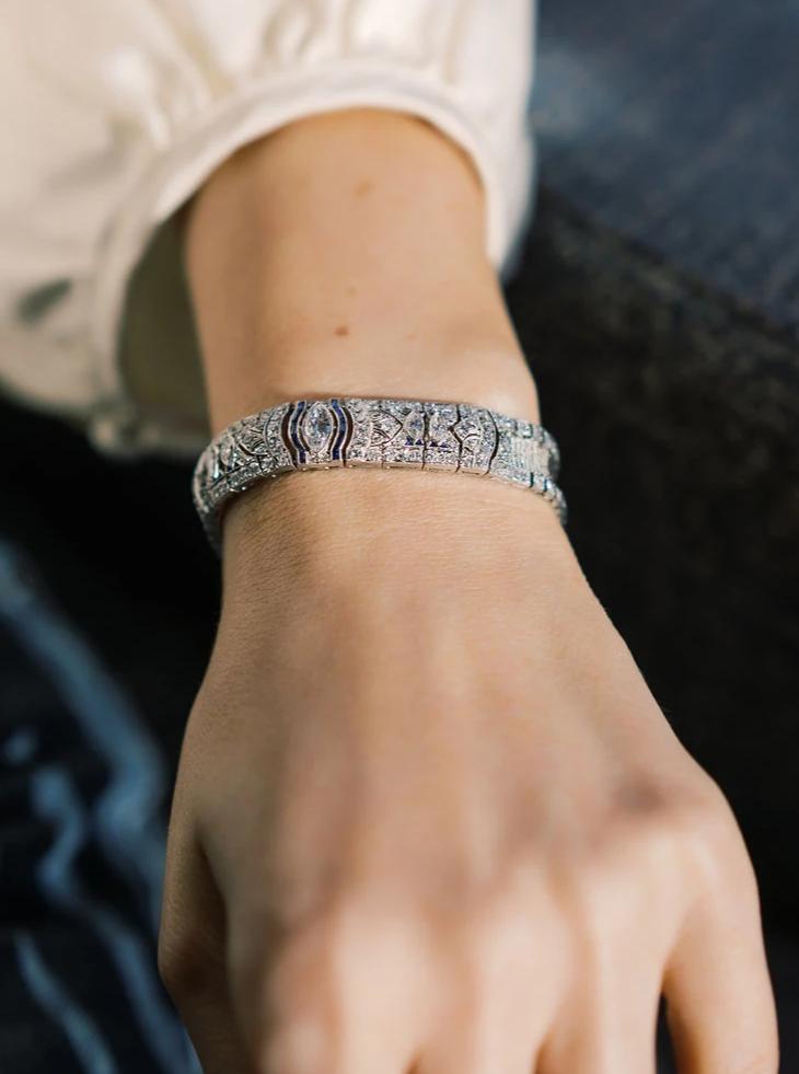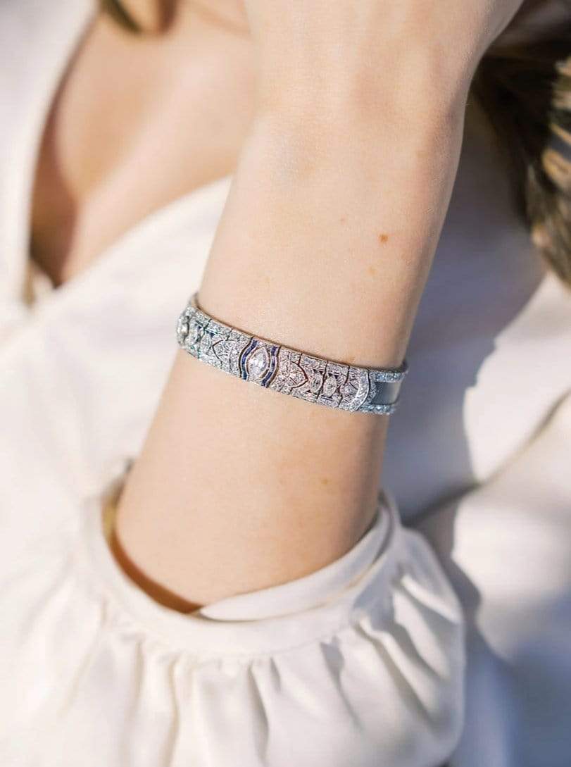 We love this sleek Art Deco bracelet for so many reasons! We love the big and prominent marquise diamonds that take center stage and the beautiful way the center one is framed by vibrant sapphires. The bracelet is delicate yet bold and the mesh adds such a cool touch.