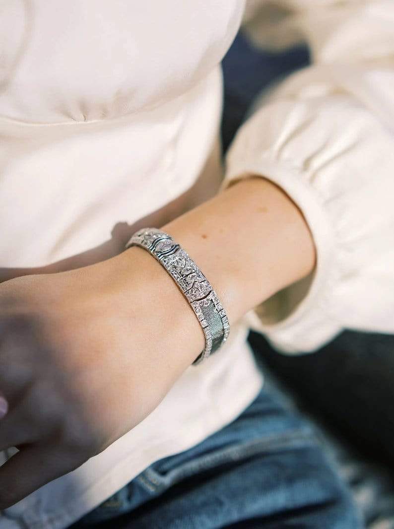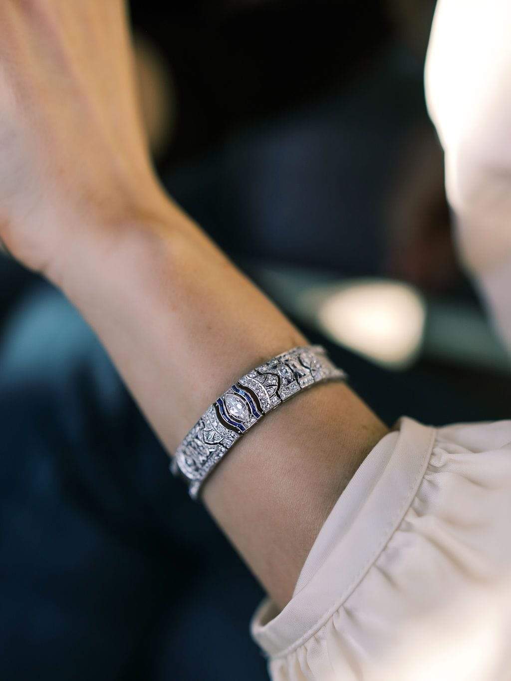 The Kimpton Bracelet is an authentic vintage bracelet from the Art Deco Era! The ring features 5 marquise cut diamonds bezel-set in the center of the bracelet. The 5 marquise diamonds combine for approximately 1.05 carats of G-H color, VS-SI clarity. There are 172 diamond small diamonds set throughout the bracelet (approximately 1.50 carats) and 10 sapphires set surrounding the center sapphire. The back half of the bracelet is a gorgeous mesh, lined on each side by a row of diamonds.
