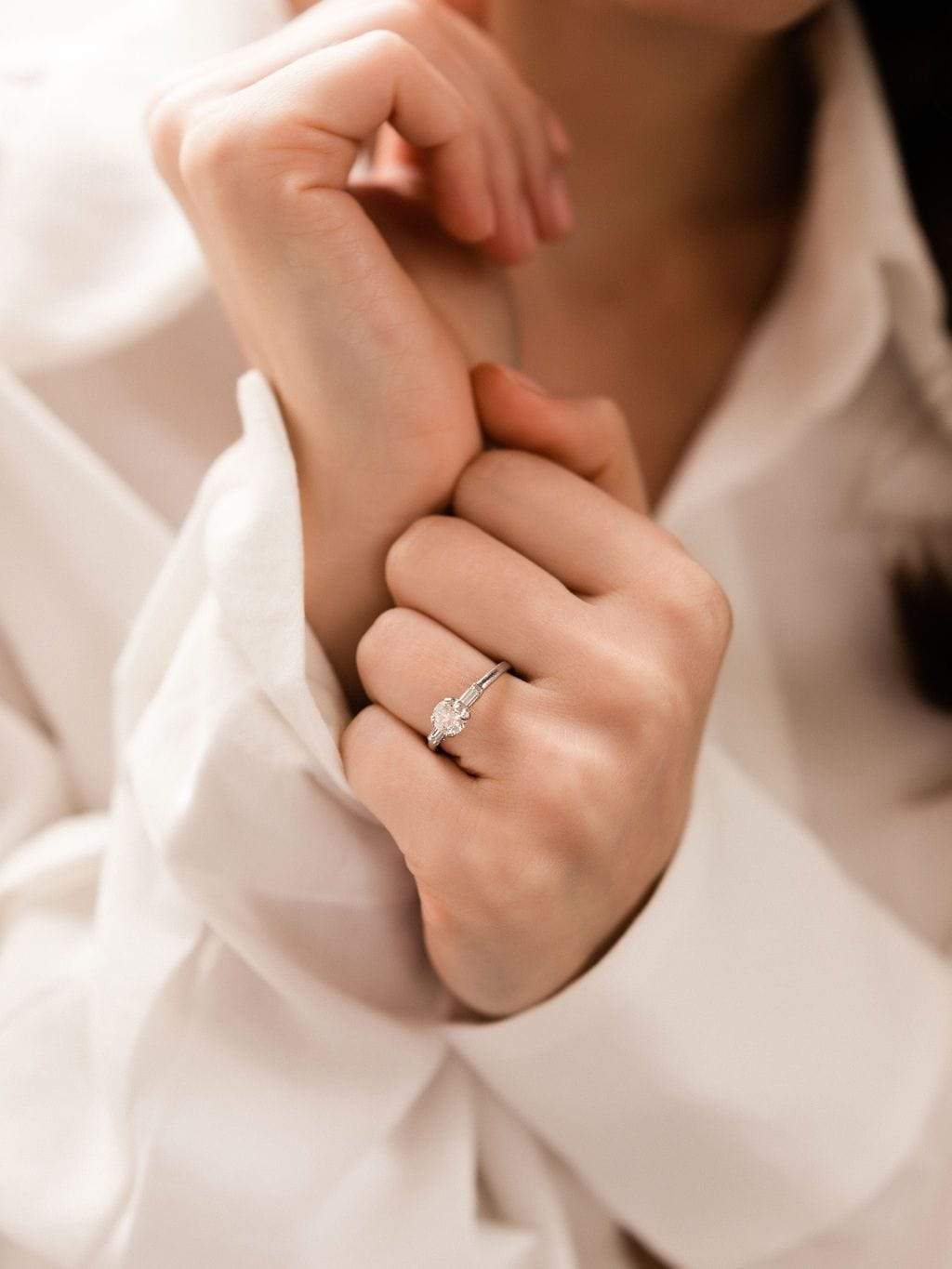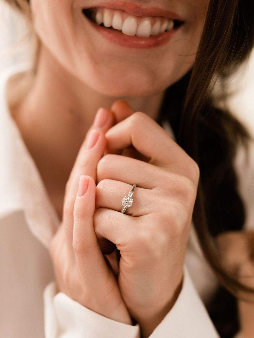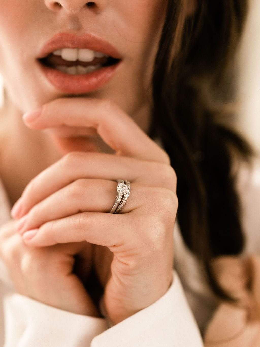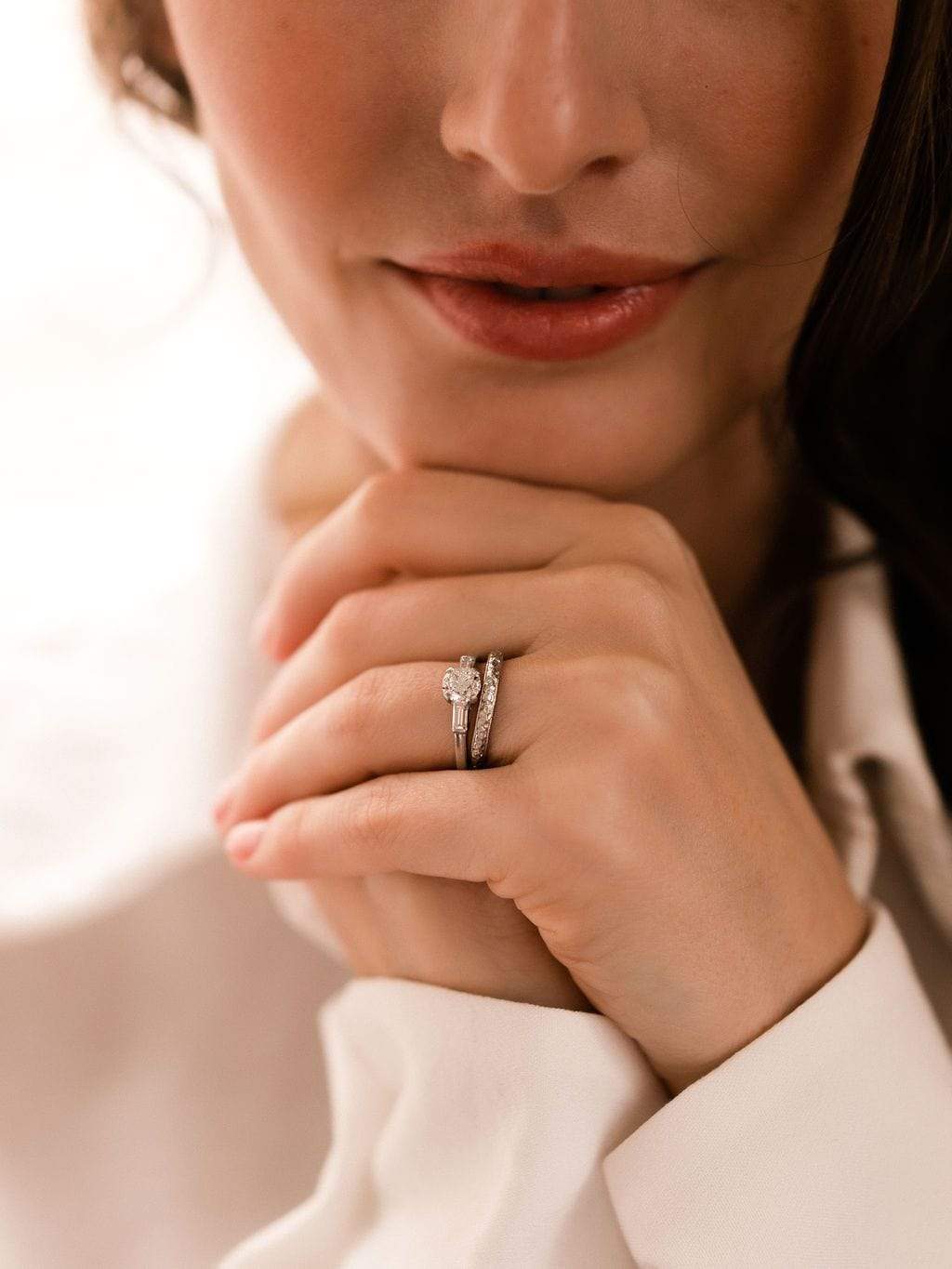 The Elton ring is an Art Deco ring circa 1930! This Art Deco Engagement Ring With Baguette Side Stones centers a GIA certified 0.77 carat European cut diamond of H color, SI1 clarity. The diamond is set in a 4 prong platinum setting with a sleek baguette to each side. The ring is currently size 6.5 and can be resized!