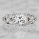 The Frances ring is an Art Deco geometric engagement ring circa 1925! This gorgeous ring centers a GIA Certified old European cut diamond weighing 1.45 carats of I color, VS1 clarity. The diamond is box-set in a platinum setting and is adorned to the sides by geometrically-themed shoulders. Each side has 6 bead-set diamonds that all combine for approximately 0.20 carats The ring is size 5.5 and can be resized.