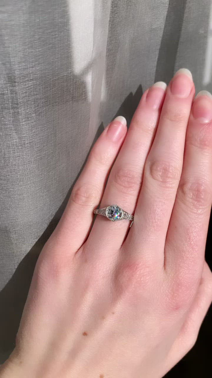 The Natt ring is an authentic vintage diamond engagement ring from the Art Deco era circa 1925. The ring centers a 0.90-carat old European cut diamond of approximately H-I color, I1 clarity. The stone is set in a platinum setting with a hexagonal outline and 3 small diamonds bead-set into each shoulder with fine millegrain details. The ring is currently size 5.75 and can be resized!