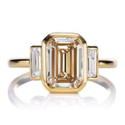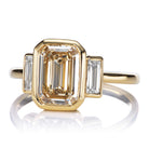 The Remmy 2.03 ring is an AB original design made right here in NYC. The ring centers a GIA-certified 2.03 carat Emerald Cut diamond of W-X Light Brown color (read: Champagne), SI1 clarity. The stone is bezel set in a setting of our signature 18kt yellow gold with a baguette is set to either side of the center stone, both combining for 0.23 carats. The ring is currently size 5.75 and can be resized!