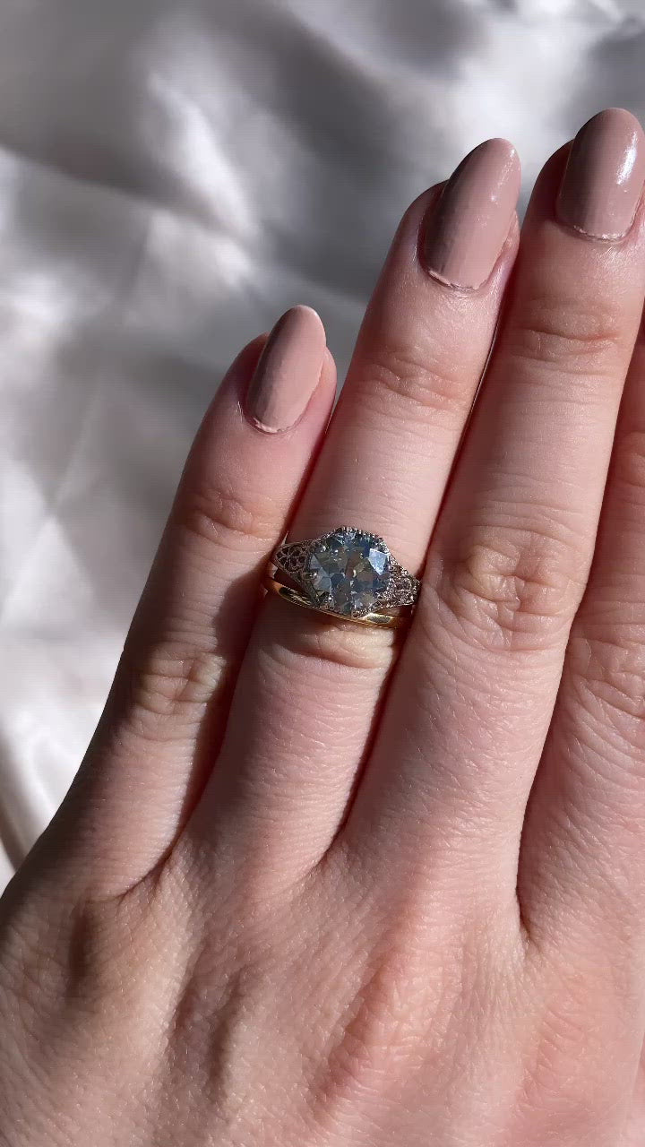 The Erica ring is an authentic vintage ring from the Art Deco Era circa 1930. The ring centers a GIA certified 2.06-carat old European cut diamond of Fancy grey color, I1 clarity. The stone is set in an 8-prong octagonal style platinum setting with beautiful filigree decorating the shoulders and gallery of the ring. The ring is currently size 4.75 and can be resized!