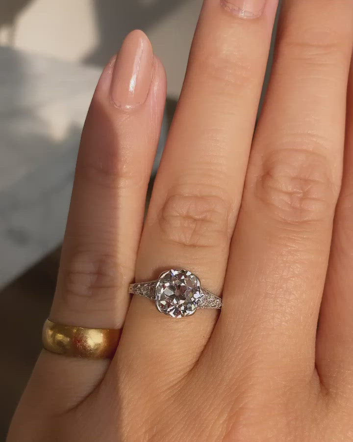 The Calais ring is an authentic vintage diamond engagement ring from the Art Deco era circa 1920. This Old Mine Cut Diamond Engagement Ring centers a GIA Certified 2.24 carat old mine cut diamond of G color, VS1 clarity. The diamond is set in a 4-prong platinum setting. Three tapering old European cut diamonds decorate each of the shoulders and combine for a total of approximately 0.25 carats. Hand engravings decorate the shank all the way around. The ring is currently size 7 and can be resized!