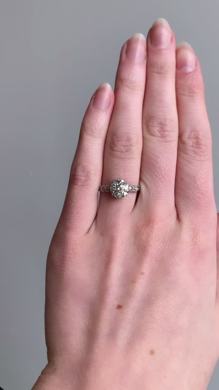 The Elysha ring is an authentic French-made diamond ring from the Art Deco era circa 1920. The ring centers a GIA-certified 1.86-carat Transitional cut diamond of J color, SI1 clarity. The stone is set in an 8-prong platinum setting with 2 old mine cut diamonds E-W-bezel-set into each shoulder. The ring is currently size 8 and can be resized!