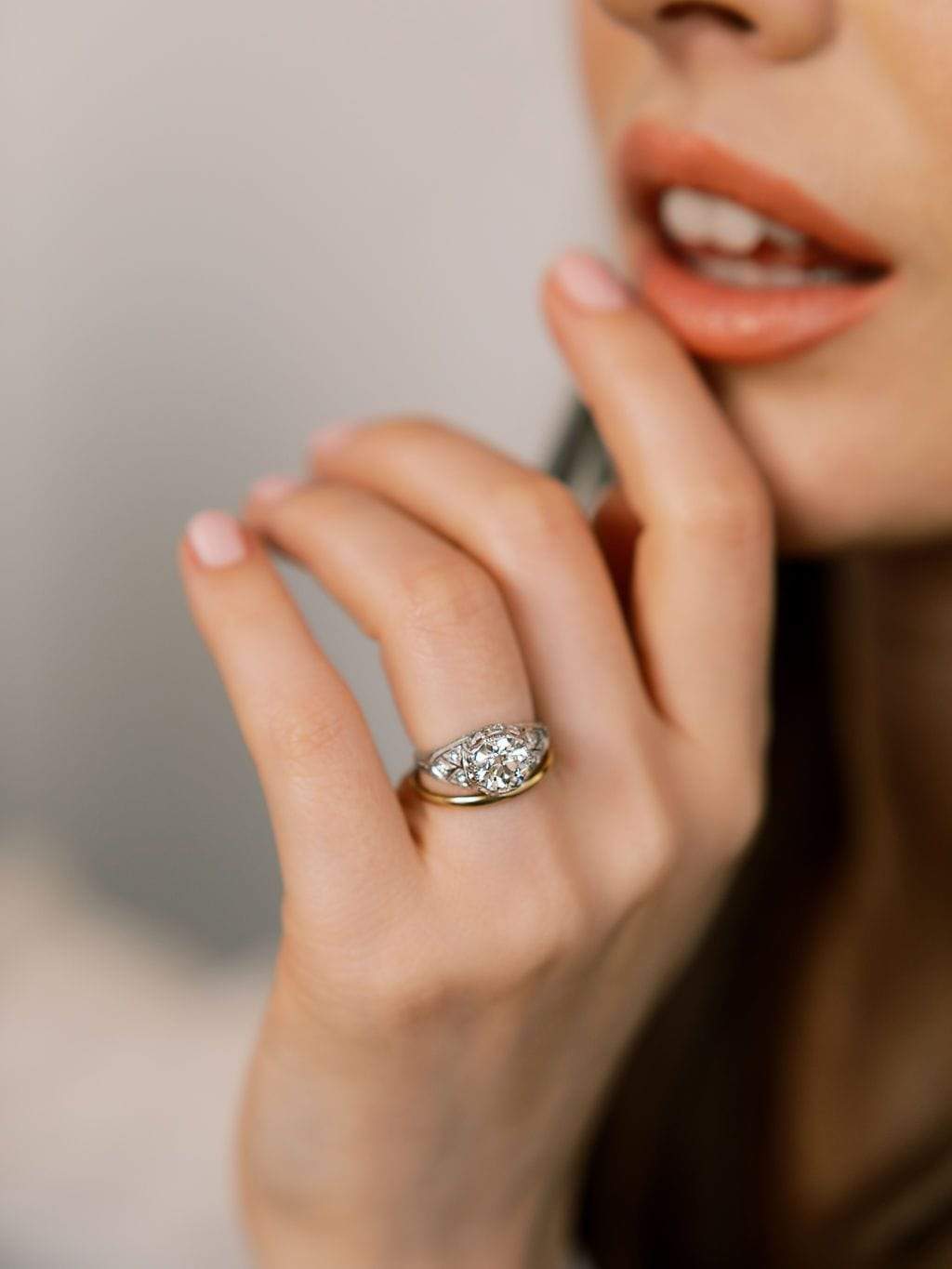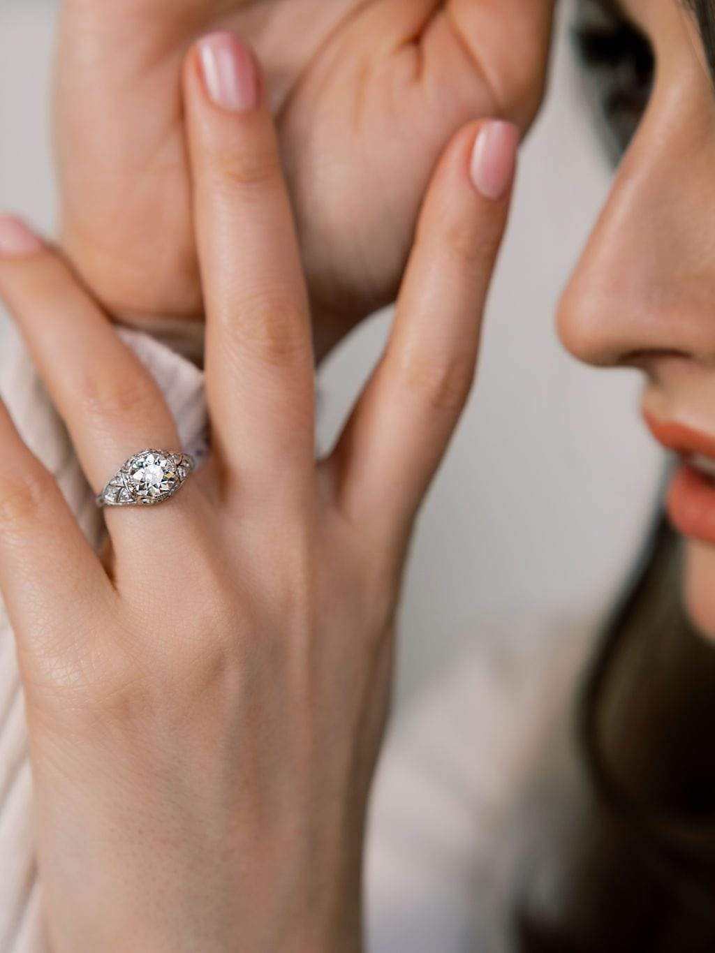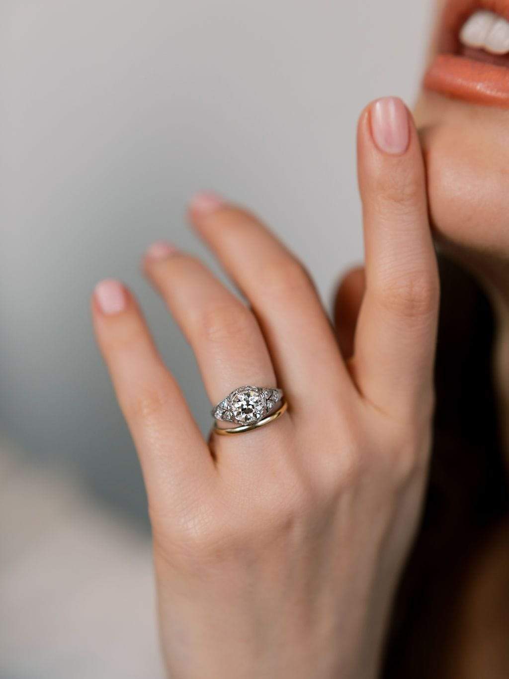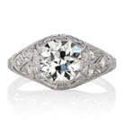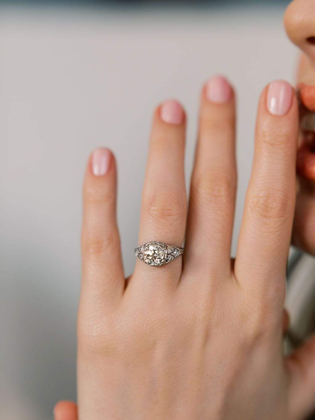 The Sally ring is a vintage diamond engagement ring from the Art Deco Era. The ring centers a GIA certified 1.32-carat old European cut diamond of J color, VS2 clarity. The stone is set in a 4 prong platinum setting. Each shoulder has three small diamonds set into delicate filigree with 4 additional diamonds in the gallery and hand engravings decorating the ring. The ring is currently size 4.5 and can be resized!