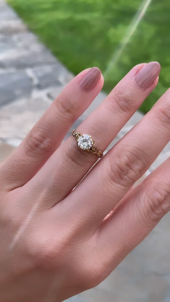 The Lilith ring is an authentic vintage ring from the Art Nouveau Era. The ring centers a GIA certified 0.84-carat Transitional cut diamond of K color, VVS2 clarity. The stone is set in a 10-karat yellow gold setting with beautifully engraved flowers on the shoulders. The ring is currently size 5 and can be resized!