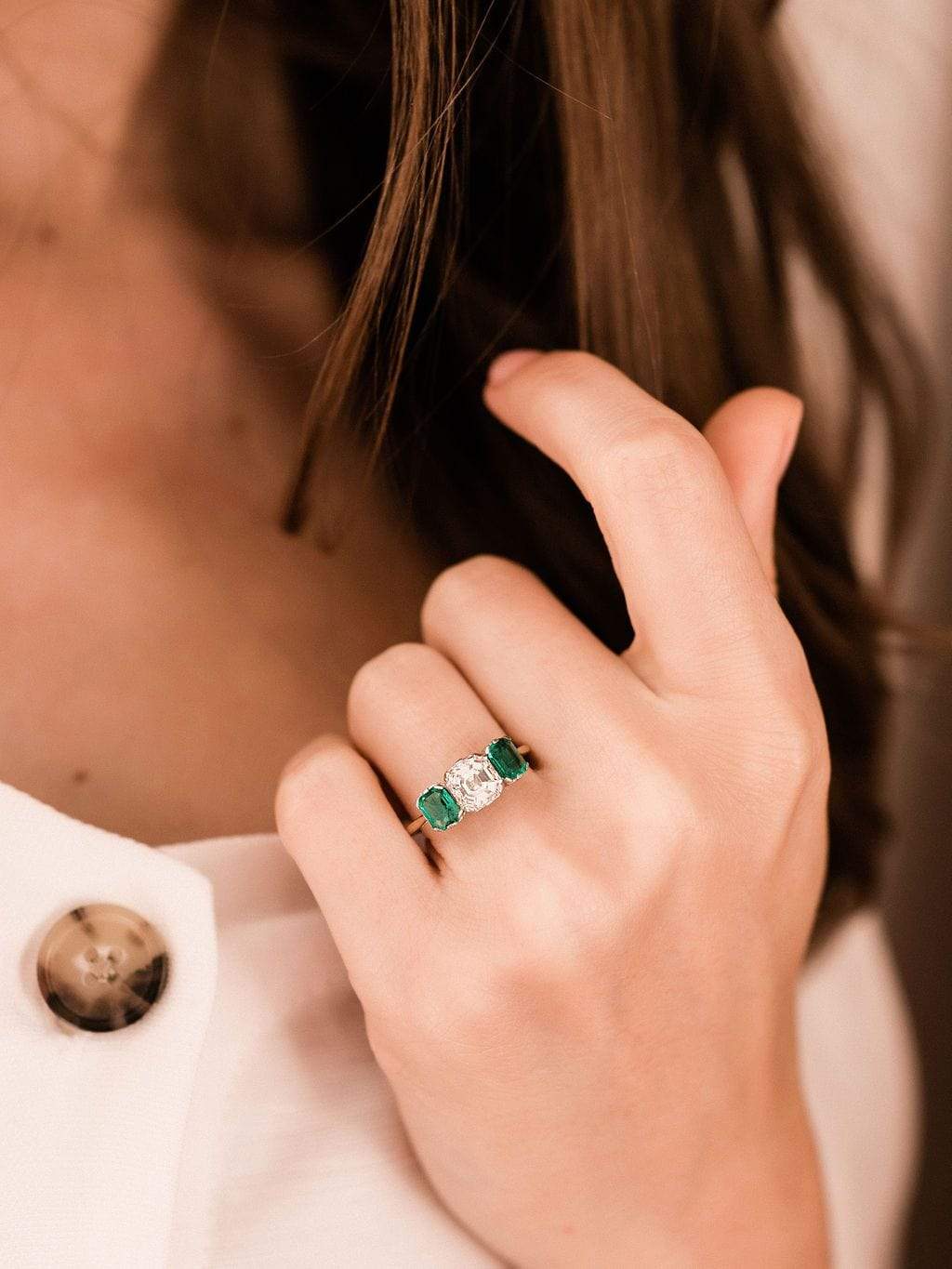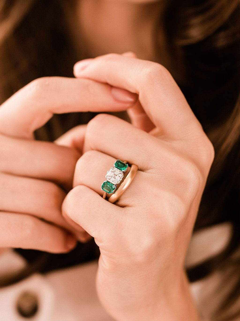 The York ring is an authentic vintage Art Deco era engagement ring circa 1920! This Asscher Cut Diamond & Emerald Engagement Ring centers a GIA certified 1.52 carat Asscher cut diamond of F color, VS2 clarity. The diamond is set in a 6-prong platinum basket with an AGL certified Columbian Emerald to each side and an 18kt yellow gold shank. The ring is currently size 6.5 and can be resized!