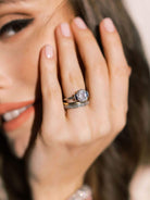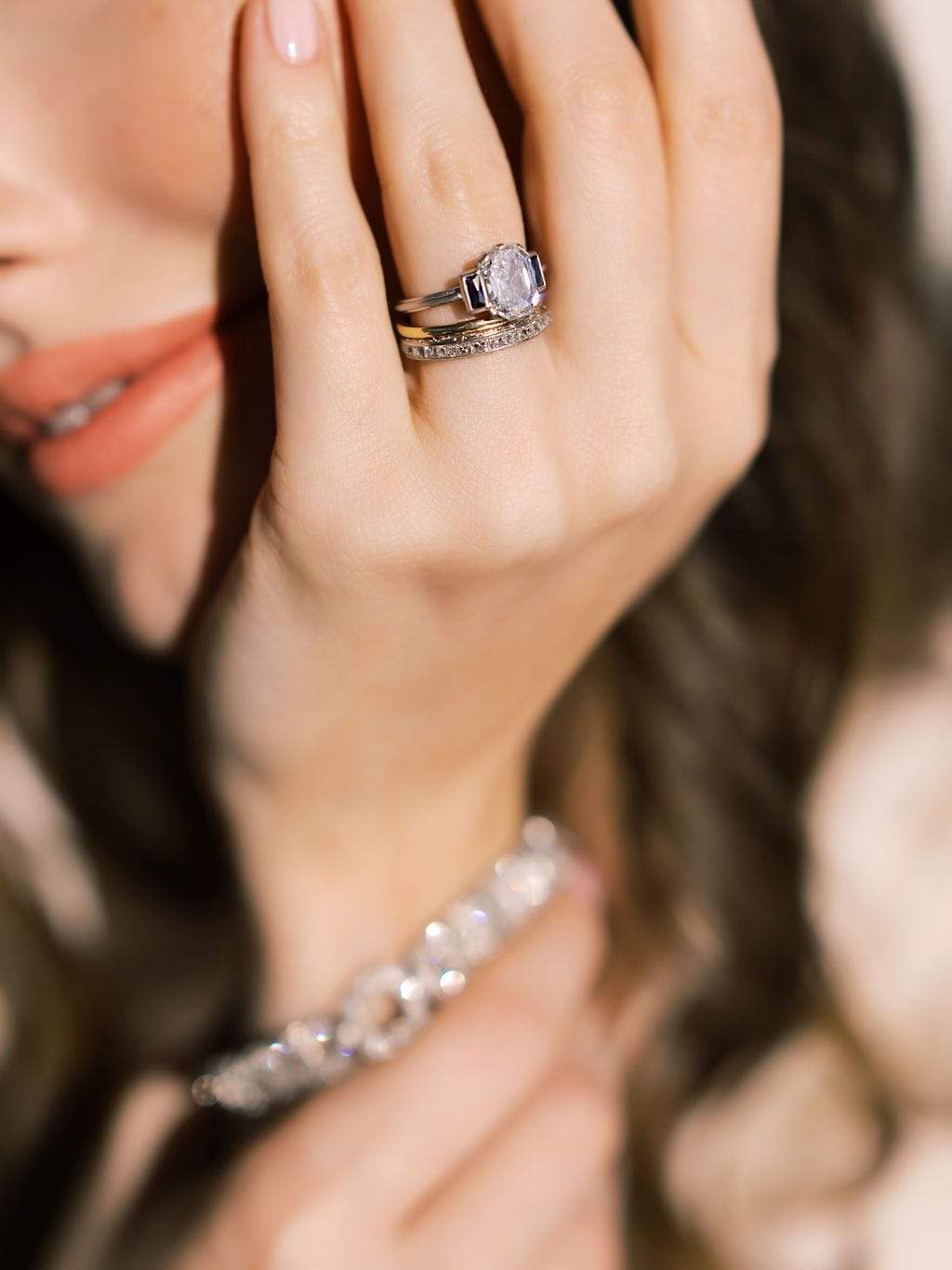 The Petra style is a bold one that we adore. This unique stone is a very cool version of an Asscher that has sleek scintillation and its icy white color pairs nicely with the vivid blue sapphires.