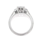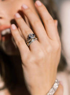 The Petra 1.55 ring is a vintage-inspired VB-made diamond engagement ring. The ring centers a GIA certified 1.55-carat Asscher cut diamond of E color, VS2 clarity. The stone is set in a 6 prong platinum setting. To each side of the center stone is a bezel-set French cut sapphire. The ring is currently size 6 and can be resized!