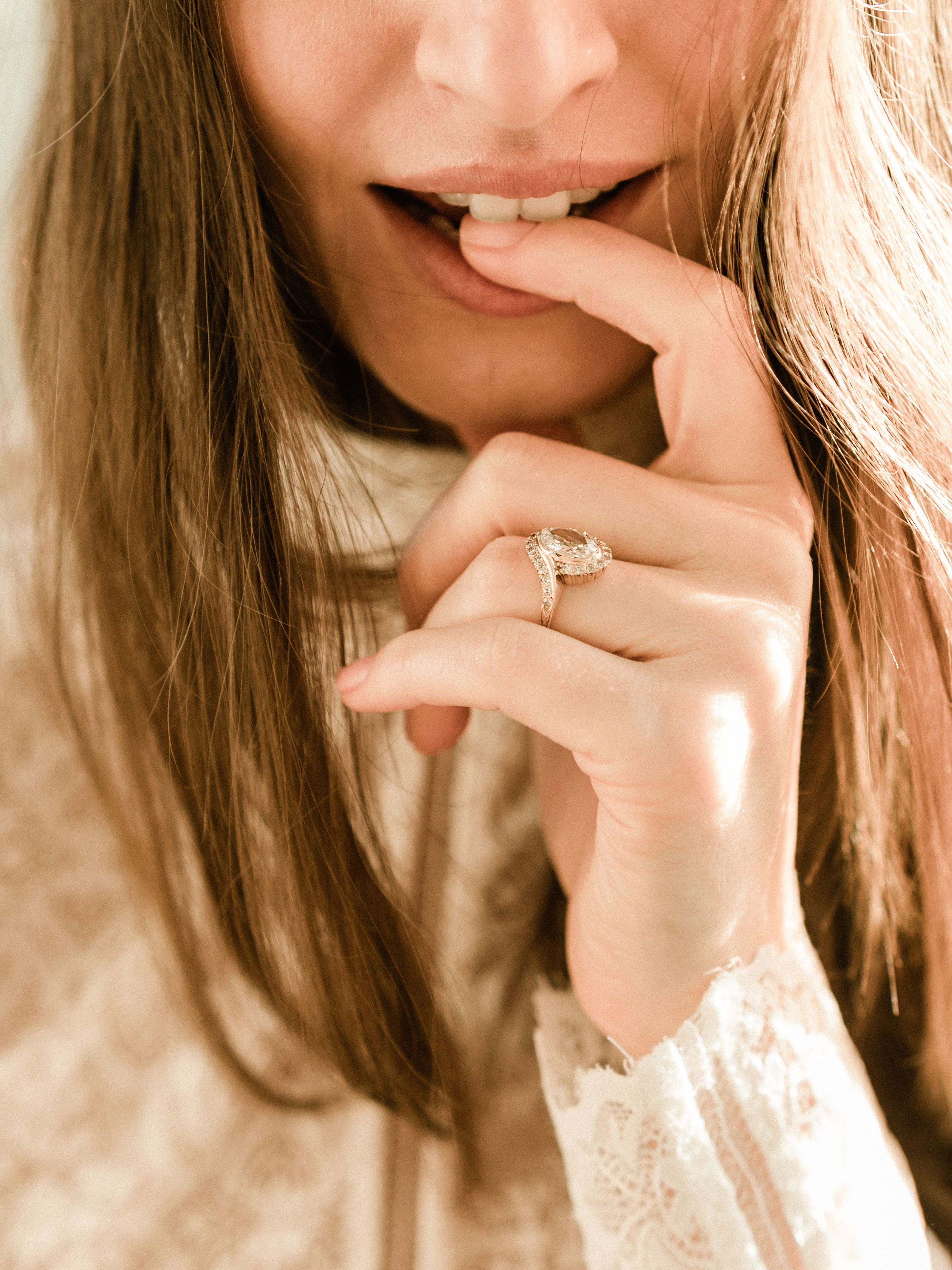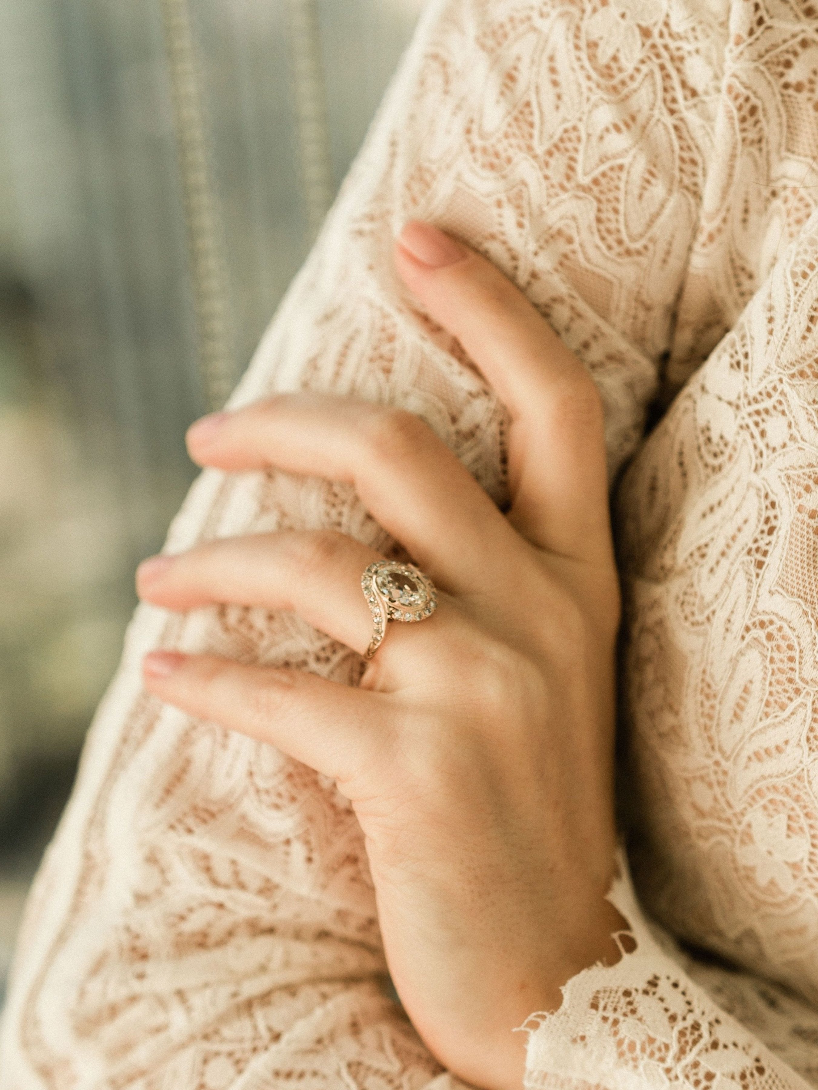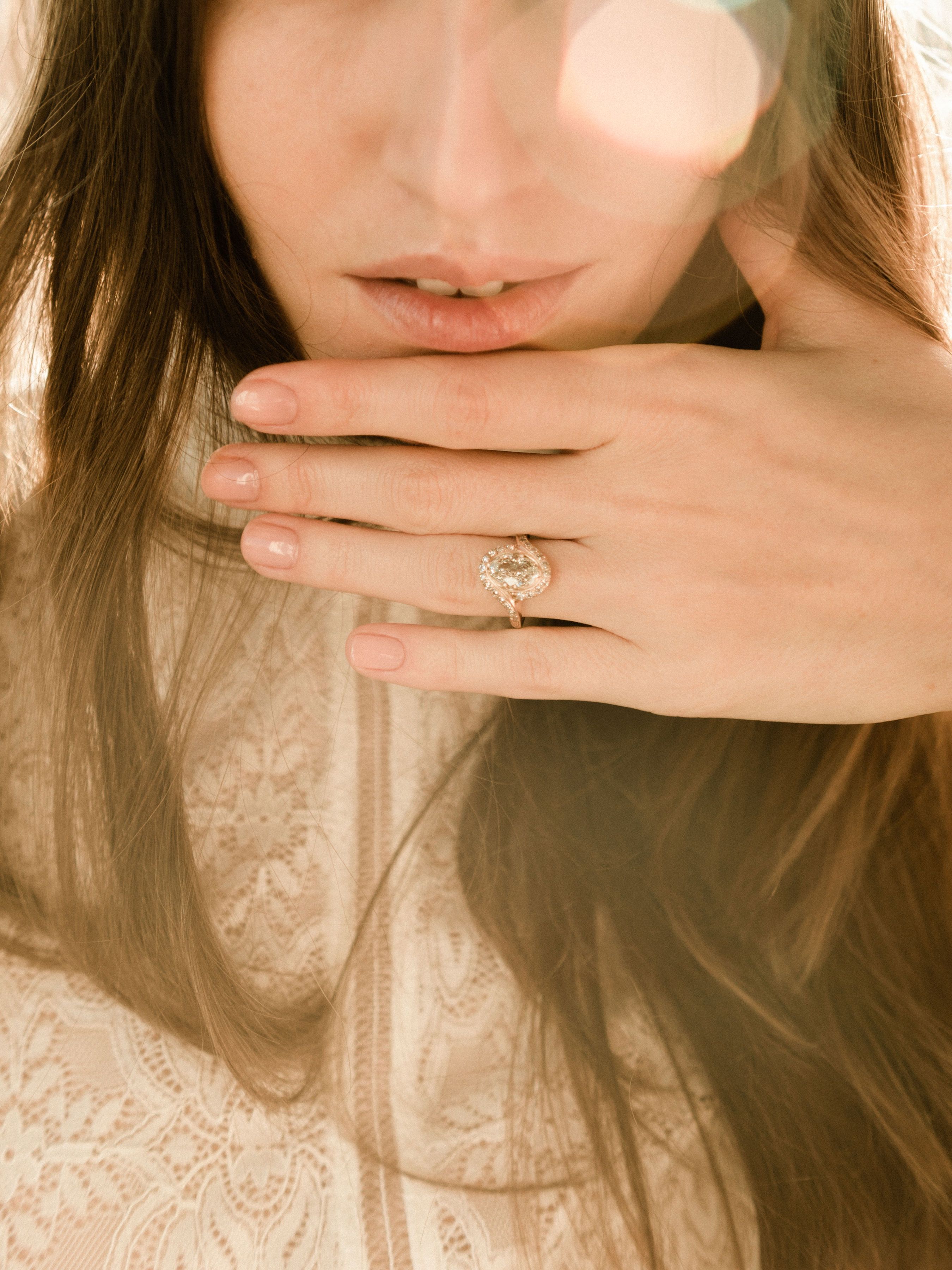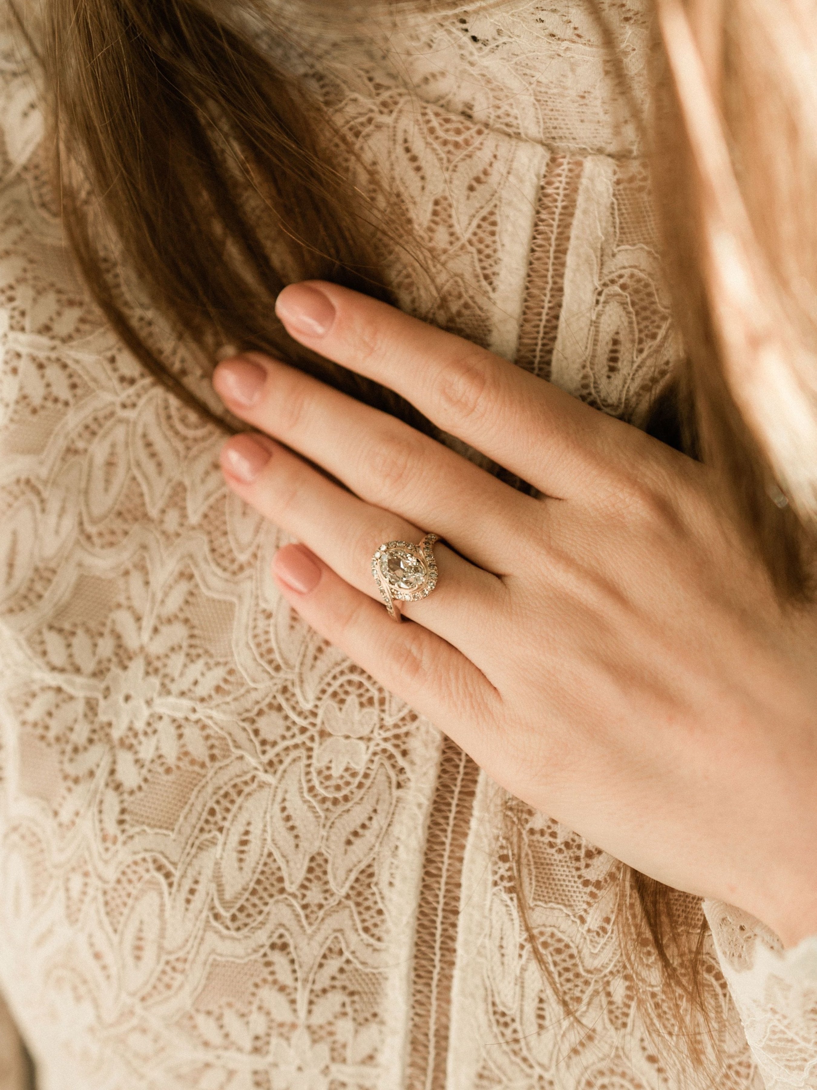 A definite unique find! The center diamond is a gorgeous antique cut and the halo adds a spin on classic with its asymmetry. Super low profile for easy wear!