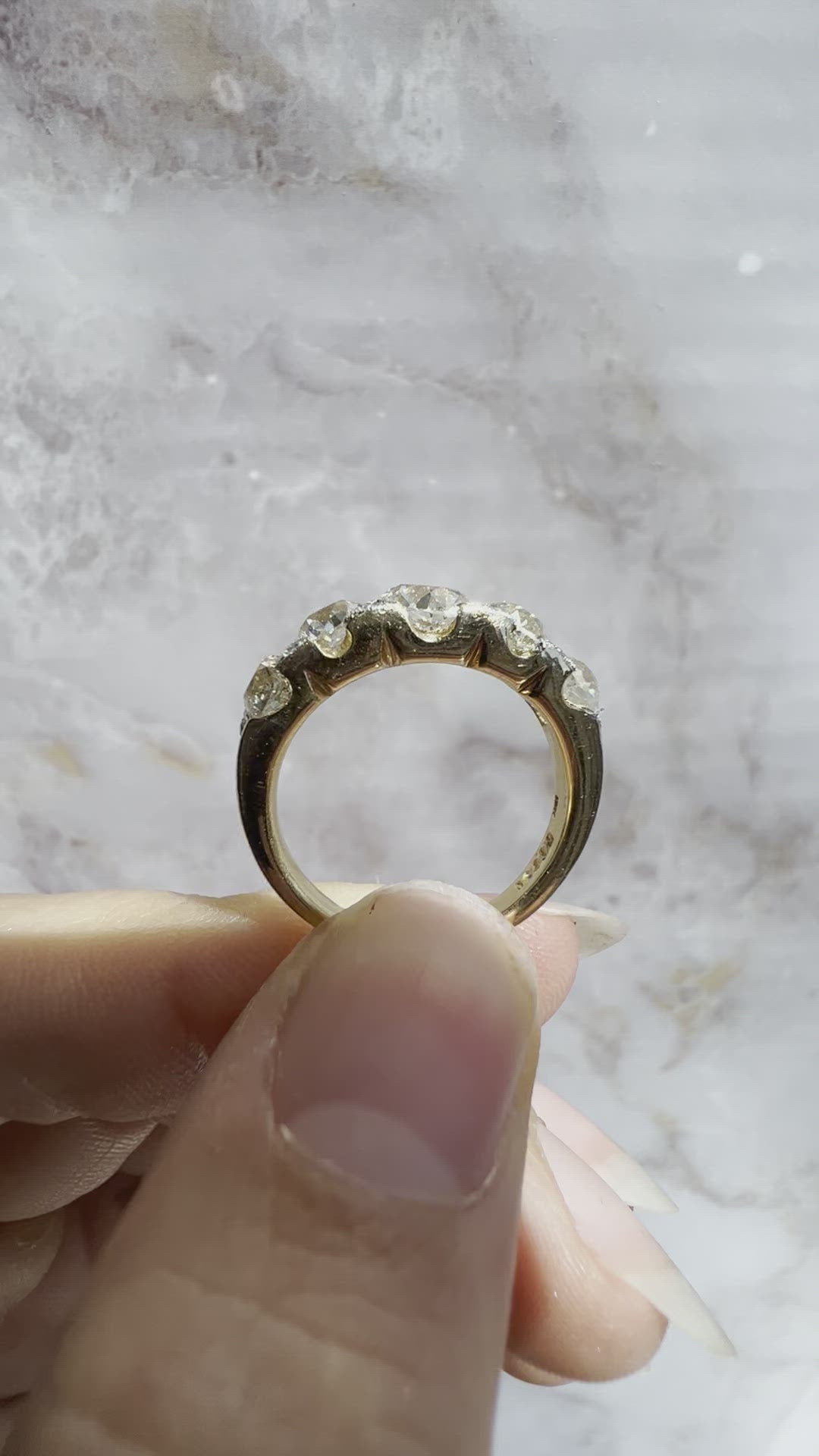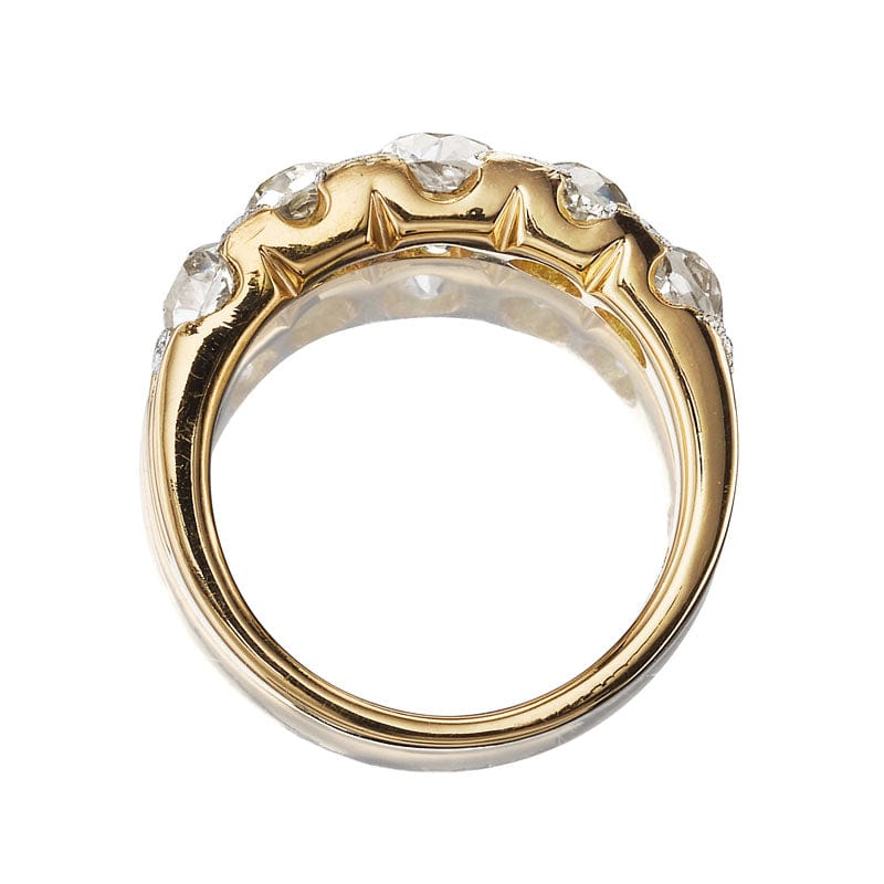 The Aubrey 0.92 ring is a VB original design made right here in NYC. The ring centers a GIA-certified 0.92-carat old mine cut diamond of J color, SI2 clarity. Four additional old mine cut diamonds of coordinating color and clarity, all combing for 1.82-carats, span the finger. The stones are set in a platinum-topped 18 karat yellow gold setting with four small diamonds set between the stones with milgrain details. The ring is currently size 5.75 and can be resized!