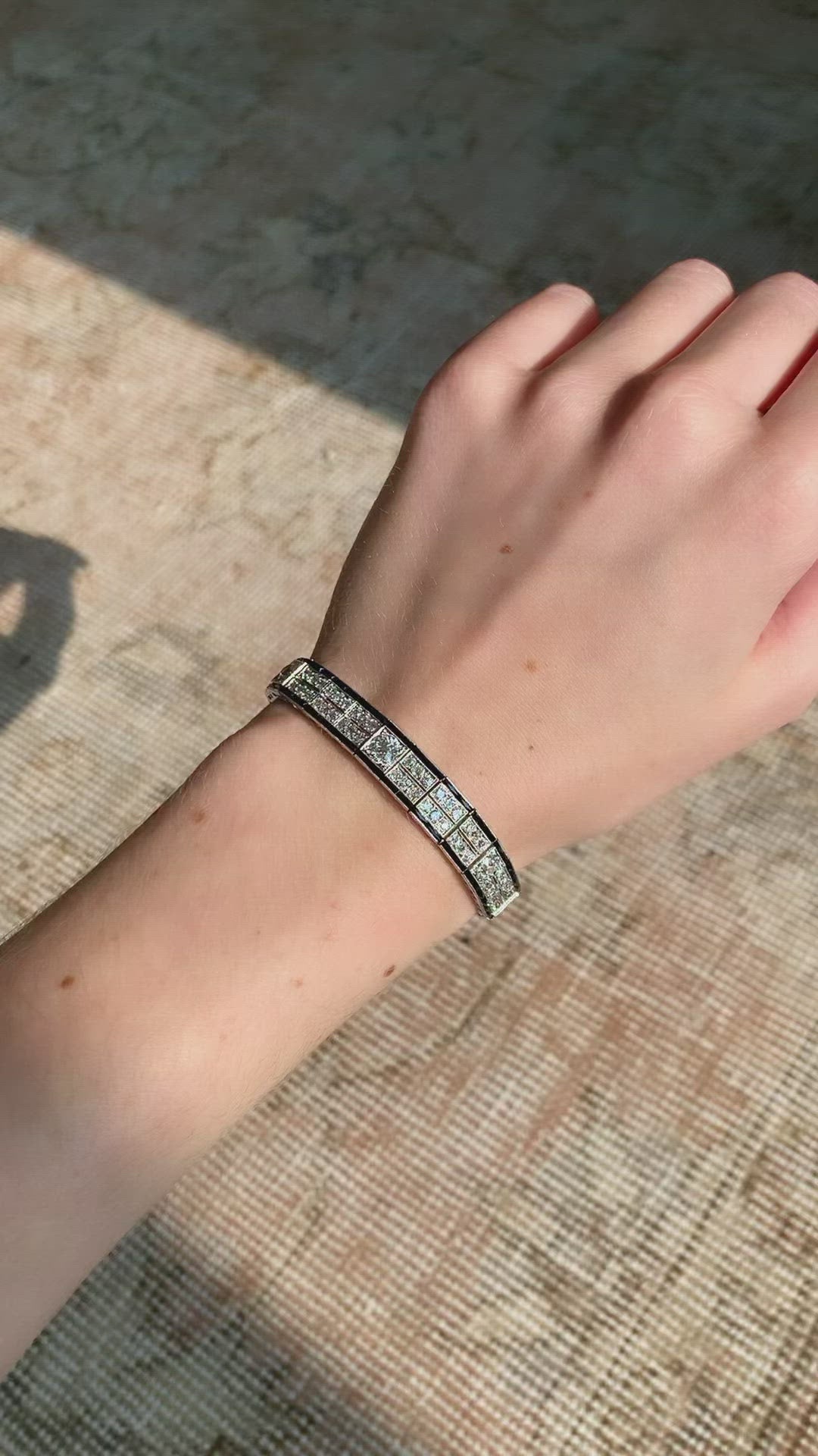The August Bracelet is an authentic Art Deco piece circa 1920. The bracelet features 7 old European cut diamonds set throughout the bracelet, of approximately H-I color, VS1-SI1 clarity that combine for approximately 1.75 carats. An additional 138 old European cut diamonds are set into the piece. The diamonds all combine for 3.65 carats. One hundred and four French-cut Onyx are channel-set along the edges of the face of the bracelet. The stones are all set in platinum and the inner circumference of the band is 6.5".