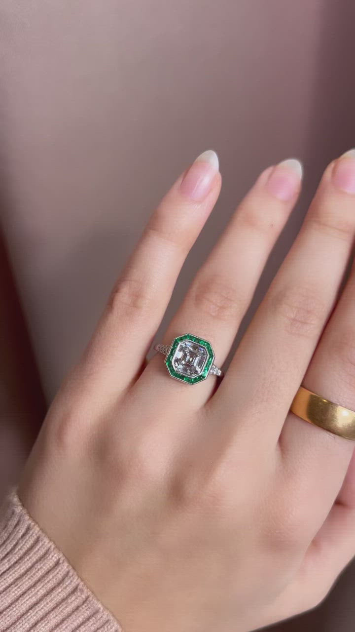 The Ave 2.11 ring is a VB original design made right here in NYC. The ring centers a GIA-certified 2.11-carat Asscher cut diamond of K color, VVS2 clarity. The stone is bezel set in a platinum setting with a halo of calibré cut emeralds. Three small old European cut diamonds are set into each shoulder of the ring. The ring is currently size 6 and can be resized!
