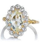 The Maxine ring is a vintage diamond ring from the Edwardian Era circa 1910. The ring centers a GIA-certified 2.51-carat Marquise Rose Cut diamond of W-X color, SI1 clarity. Surrounding the center stone is a halo of 14 Old Cut diamonds of approximately J-K color. The stones are set in a two-tone 18kt yellow gold and platinum setting. The ring is currently size 6 and can be resized!