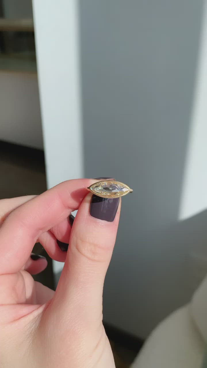 The Betty 1.79 ring is a VB original design made right here in NYC. The ring centers a GIA-certified 1.79-carat Moval (Modified Marquise) cut diamond of N color, VS1 clarity. The stone is bezel-set East-West in an 18 karat yellow gold setting. The ring is currently size 6.75 and can be resized!