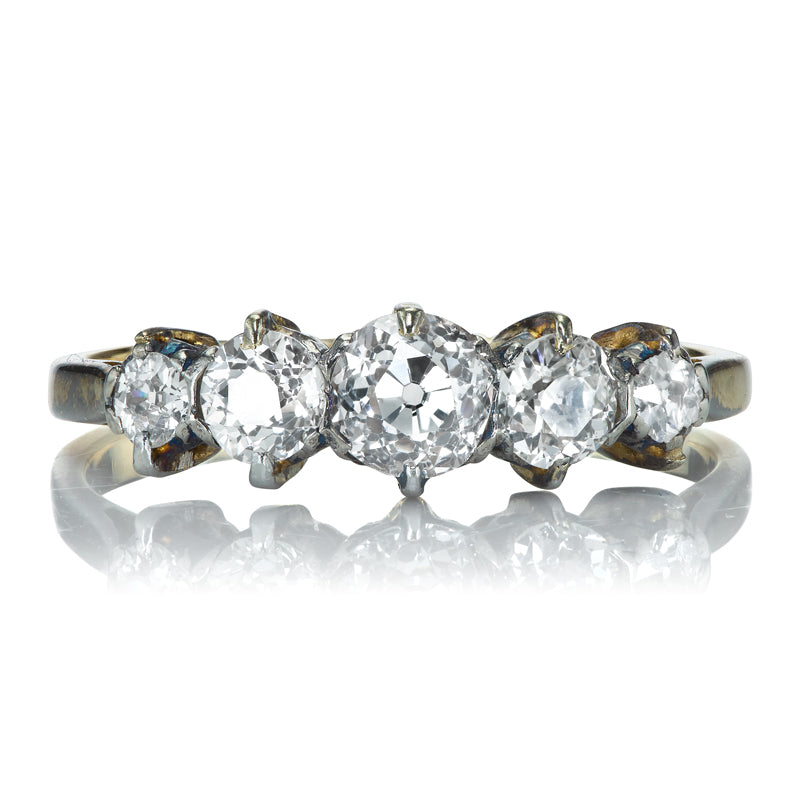 The Bevan ring is an authentic vintage diamond ring from the Edwardian Era circa 1905. The ring features five Old Mine Cut diamonds of approximately H-I color, SI clarity, totaling approximately 0.70 carats. The stones are set in a 12kt and 18kt gold setting with patina. The ring is currently size 5.5+ and can be resized!