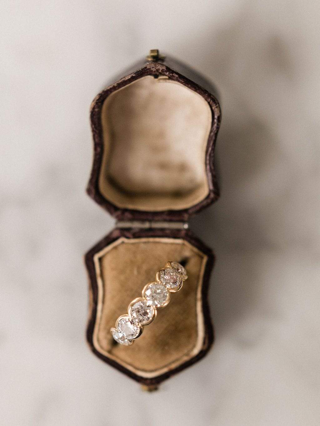 The Allure 1.94 band is a VB-made diamond wedding band with antique diamonds! This Bezel Set 6 Diamond Wedding Band features 6 old European cut diamonds that combine for 1.94 carats that are half bezel-set in an 18kt yellow gold setting. The ring is currently size 5.5 and can be resized!