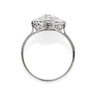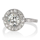 The Pru ring is a vintage engagement ring from the Edwardian Era. The ring centers a GIA Certified 1.56 carat old European cut diamond of J color, VS2 clarity. The diamond is bezel-set in a platinum setting with a halo of 16 old cut diamonds. The band has beautiful hand engravings. The ring is size 8.25 and can be resized!