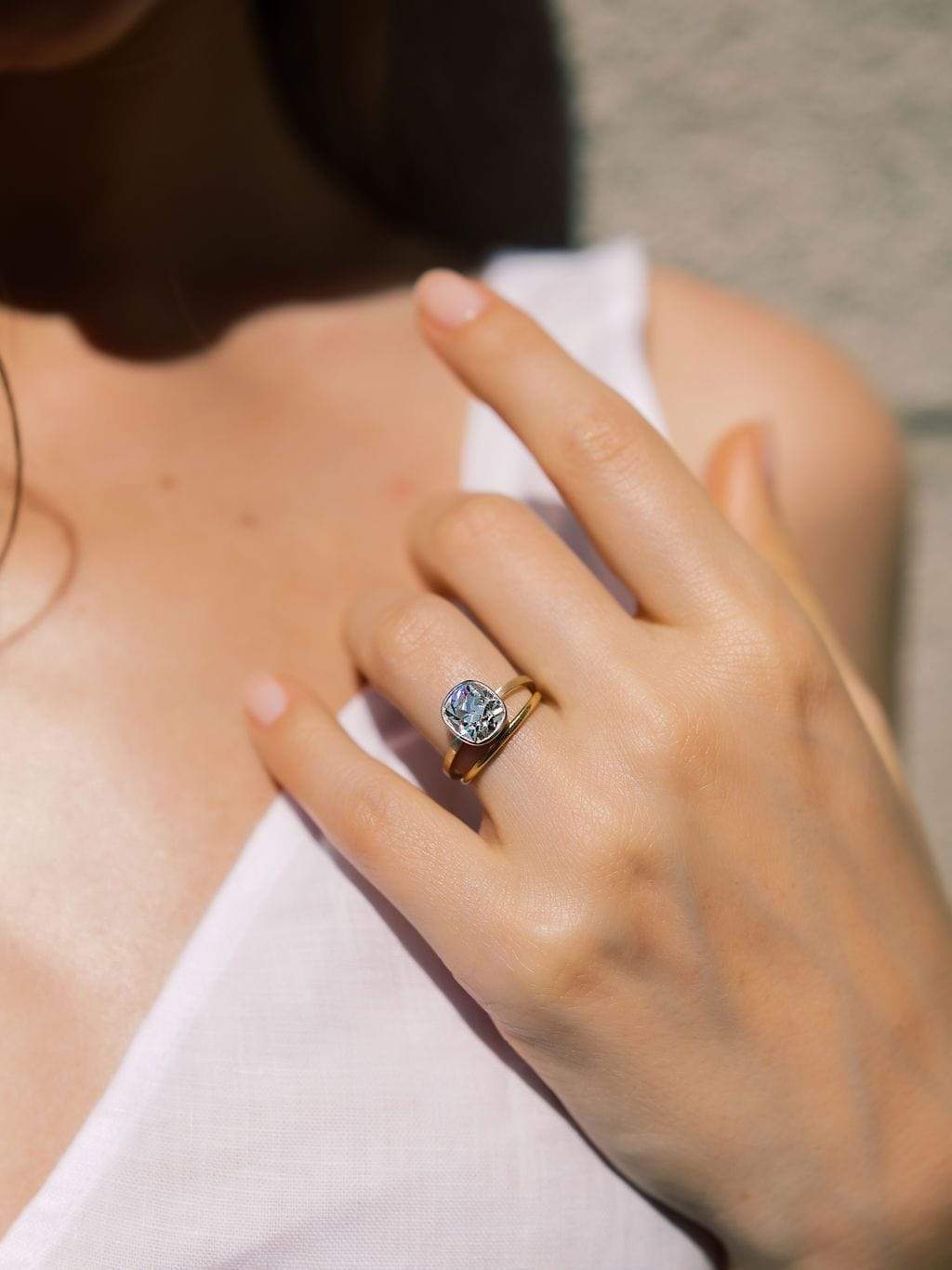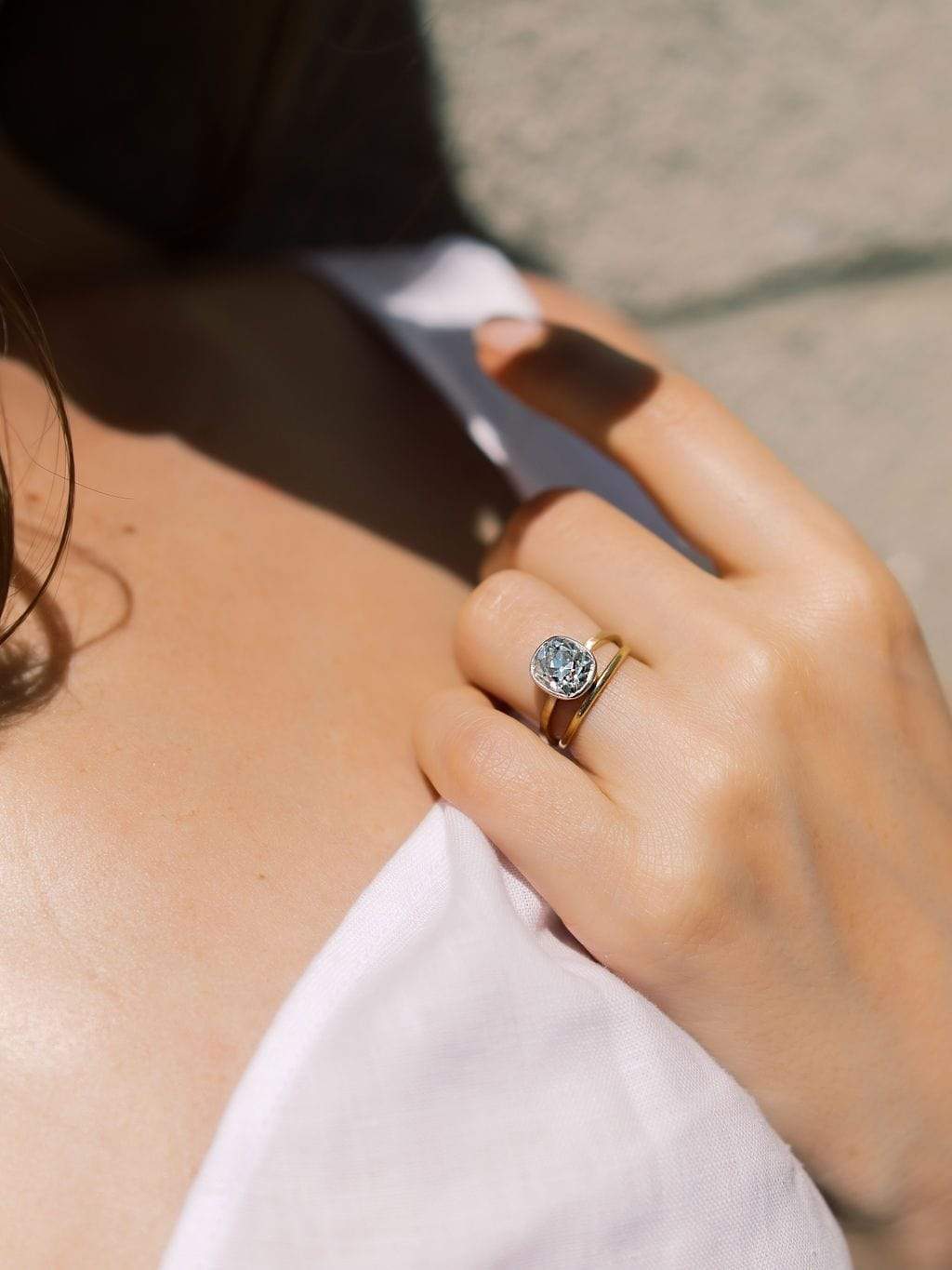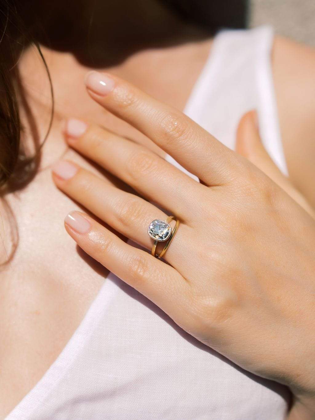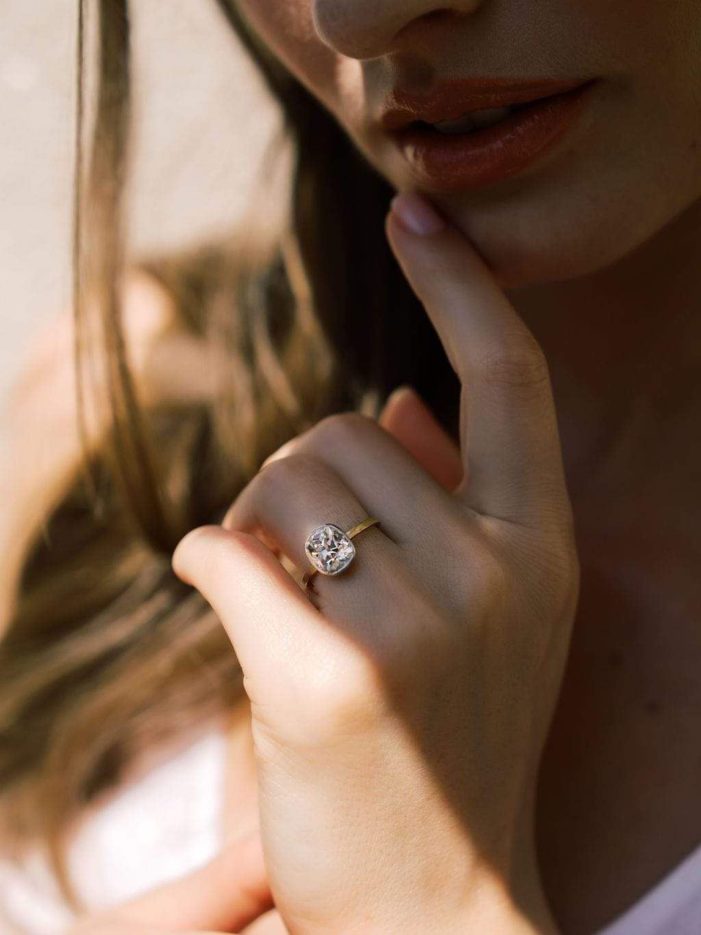 That diamond has the perfect elongated cushion shape which is emphasized by the bezel setting! This chunky stone sparkles incredibly with its broader facets and higher crown! The ring sits low to the finger for an easy wear!