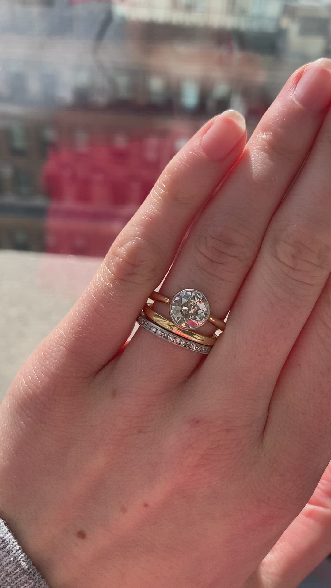 The Lilly 2.11 ring is a VB original made right here in NYC centering an authentically antique diamond. The ring centers a GIA certified 2.11-carat transitional cut diamond of L color, VS1 clarity. The stone is set in a platinum bezel on an 18 karat yellow gold ring. The ring is currently size 7 and can be resized!