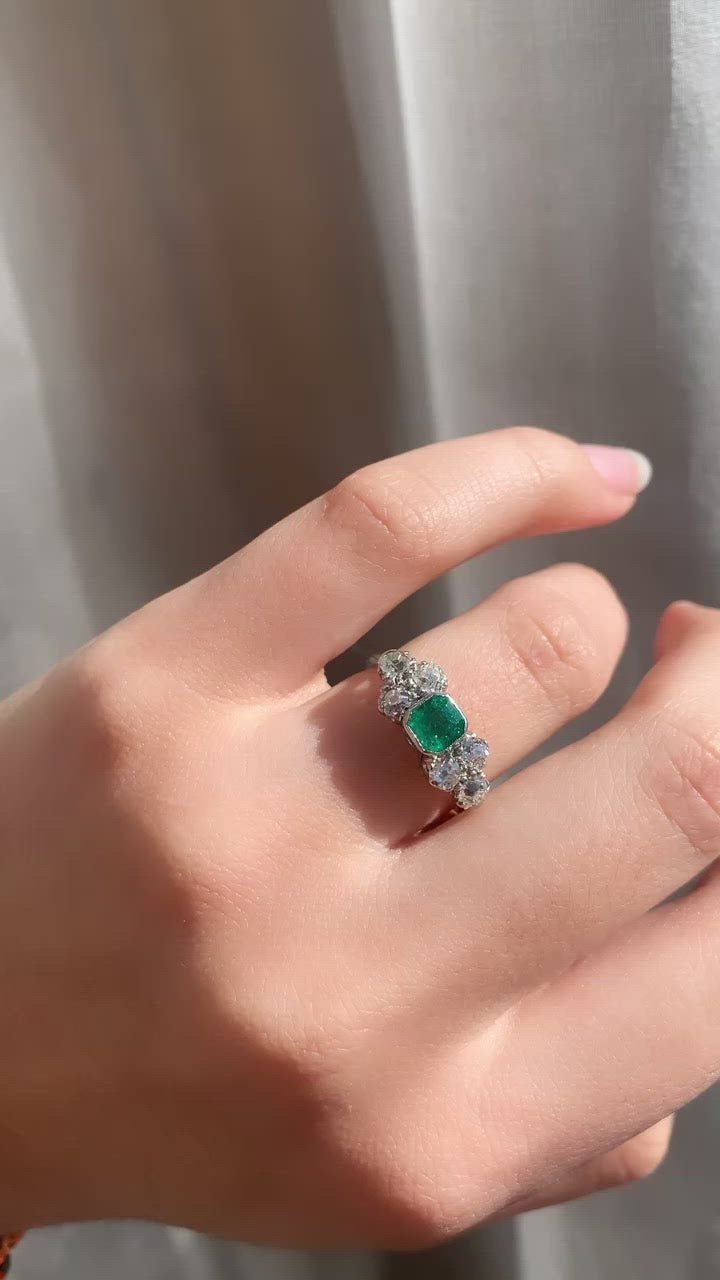 Such a fun and unique ring that perfectly pairs the vibrant emerald and the old mine cut diamonds add a fun antique charm to this finger-spreading beauty!