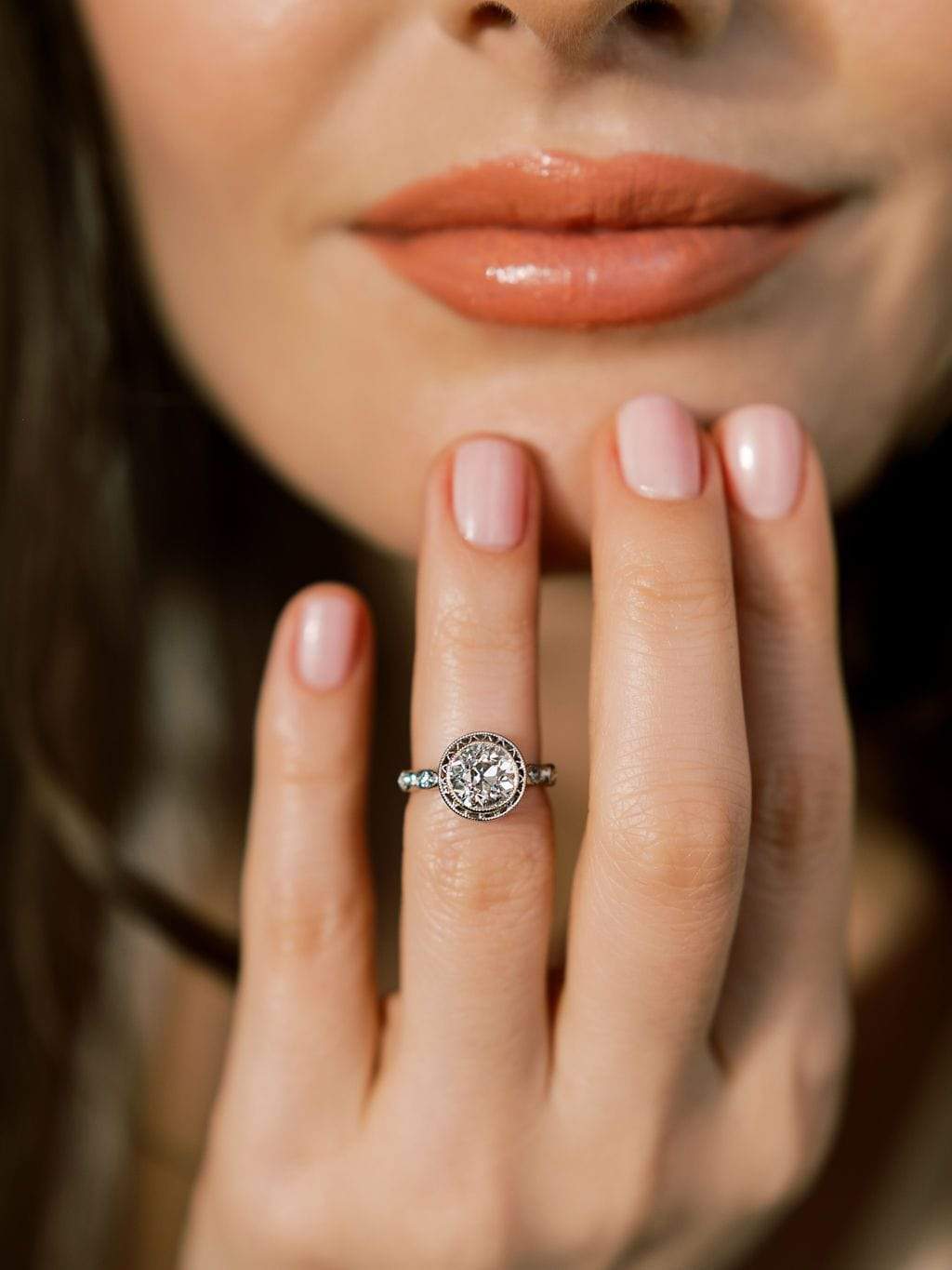 This ring is an Art Deco beauty with lots of fine details in one elegant ring. The diamond is just beautiful and incredibly white and lively. It is set sleekly in a bezel with a gorgeous metal halo. The shoulders are dainty and flowing and very florally inspired. Subtle hand engravings decorate the profile view to complete this beautiful ring.