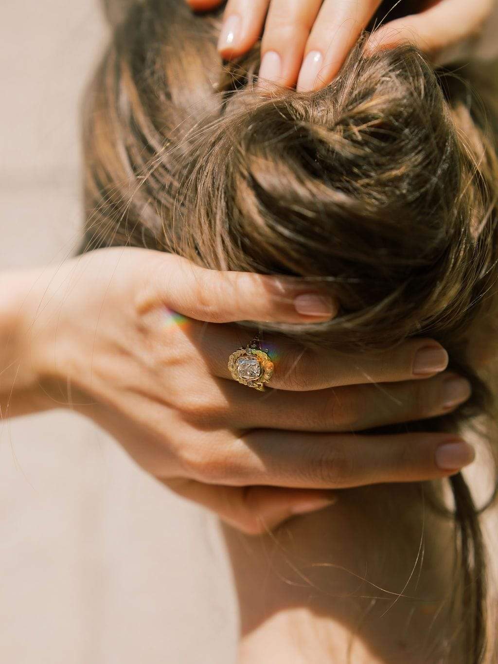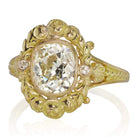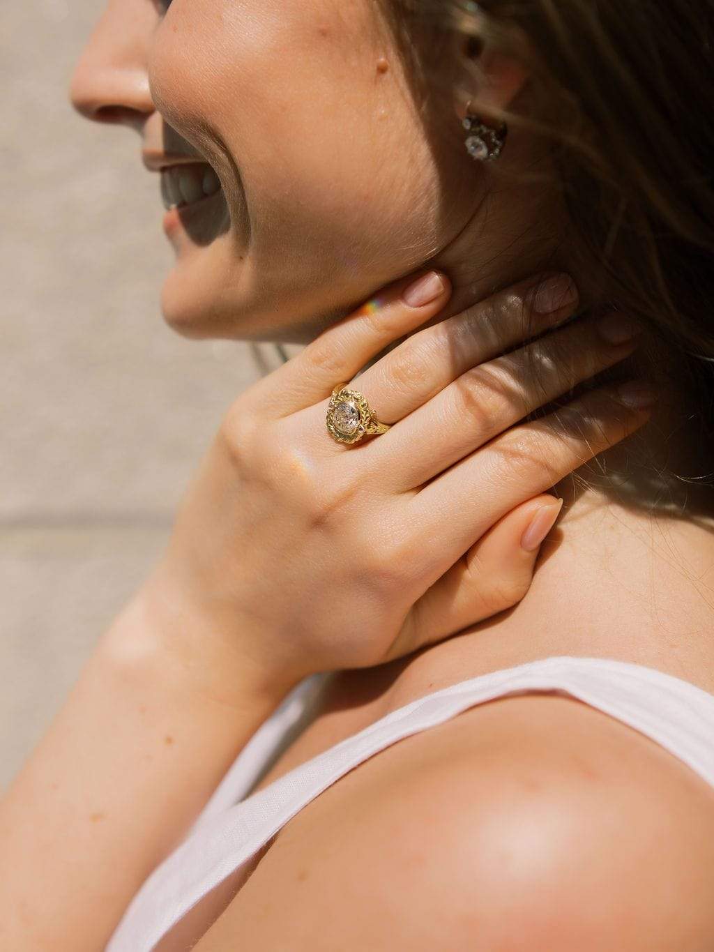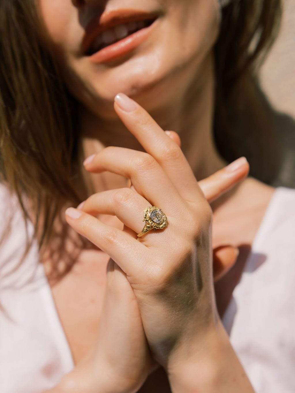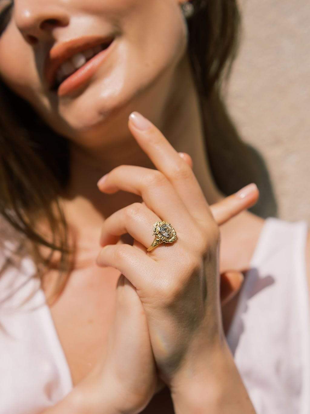 A very unique piece based on an authentic French Art Nouveau piece that we once had! The diamond has that gorgeous elongated old mine cut shape with a gorgeous sparkle and the whole piece is elegant and low-profile with excellent finger coverage!