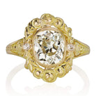 The Mira 1.84 ring is a vintage-inspired VB made engagement ring with an authentically antique diamond! This Cushion Cut Diamond Engagement Ring centers a GIA Certified 1.84-carat old mine cut diamond of O-P color, VS2 clarity. The diamond is bezel set in an 18kt yellow gold ring with a carved floral golden halo. To each side is a small rose cut diamond that is bezel-set. The shoulders have gorgeous metalwork and engraved details. The ring is currently size 6.25 and can be resized!