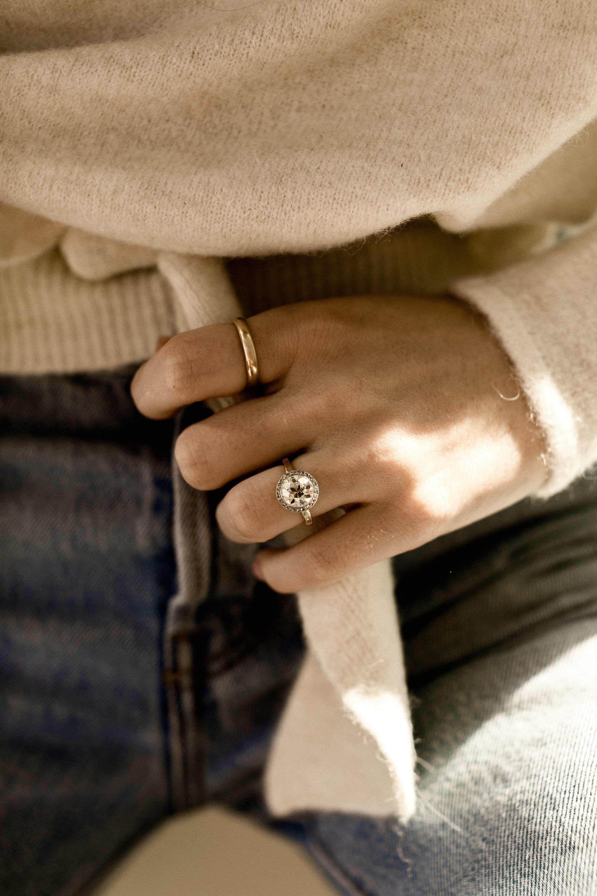The Lina Ring is an Edwardian Engagement Ring circa 1910! This bezel set halo diamond engagement ring centers a GIA Certified 2.21 carat old European cut diamond of M color, SI2 clarity. The diamond is bezel-set in a platinum-topped 14kt yellow gold setting. A thin halo of rose cut diamonds surrounds the center stone. The ring is size 5.75 and can be resized!