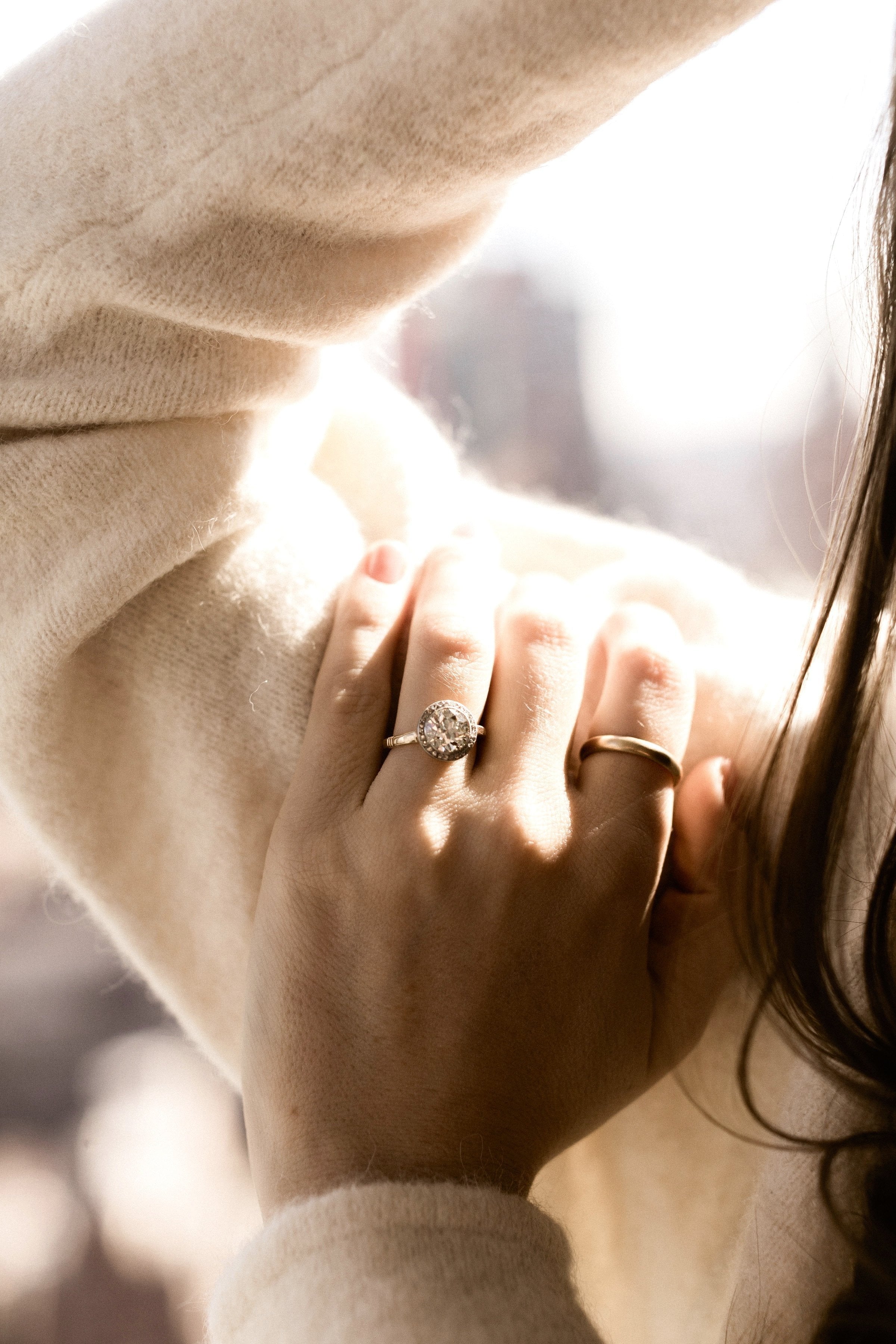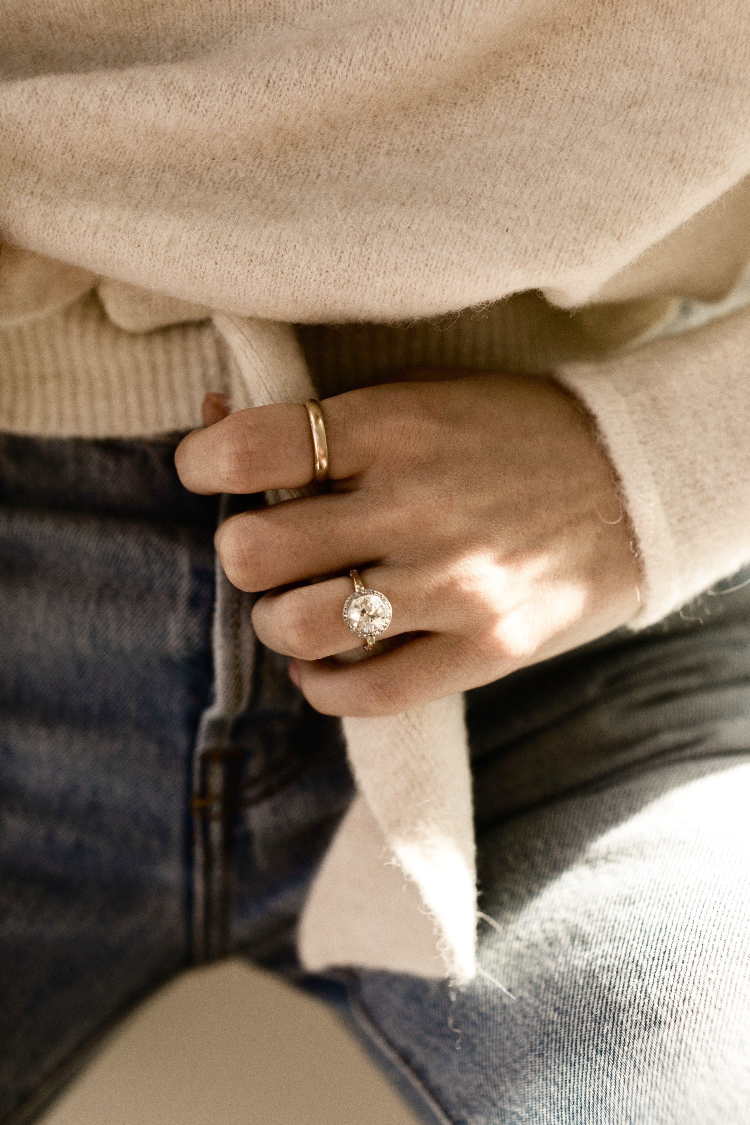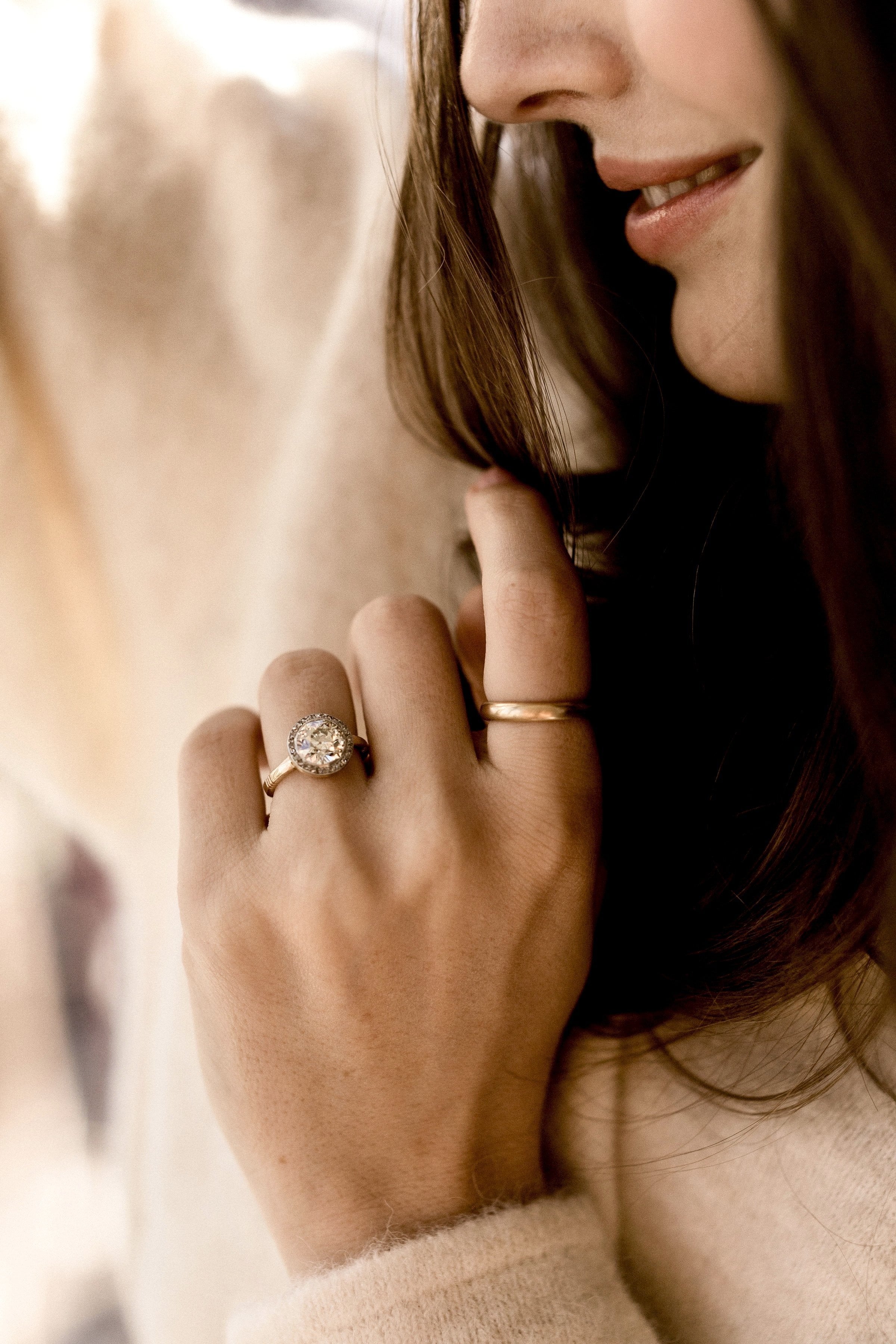 A really beautiful, more clean cluster look with the bezel setting and thinner halo creates a really romantic look! Super low profile and very easy to wear!