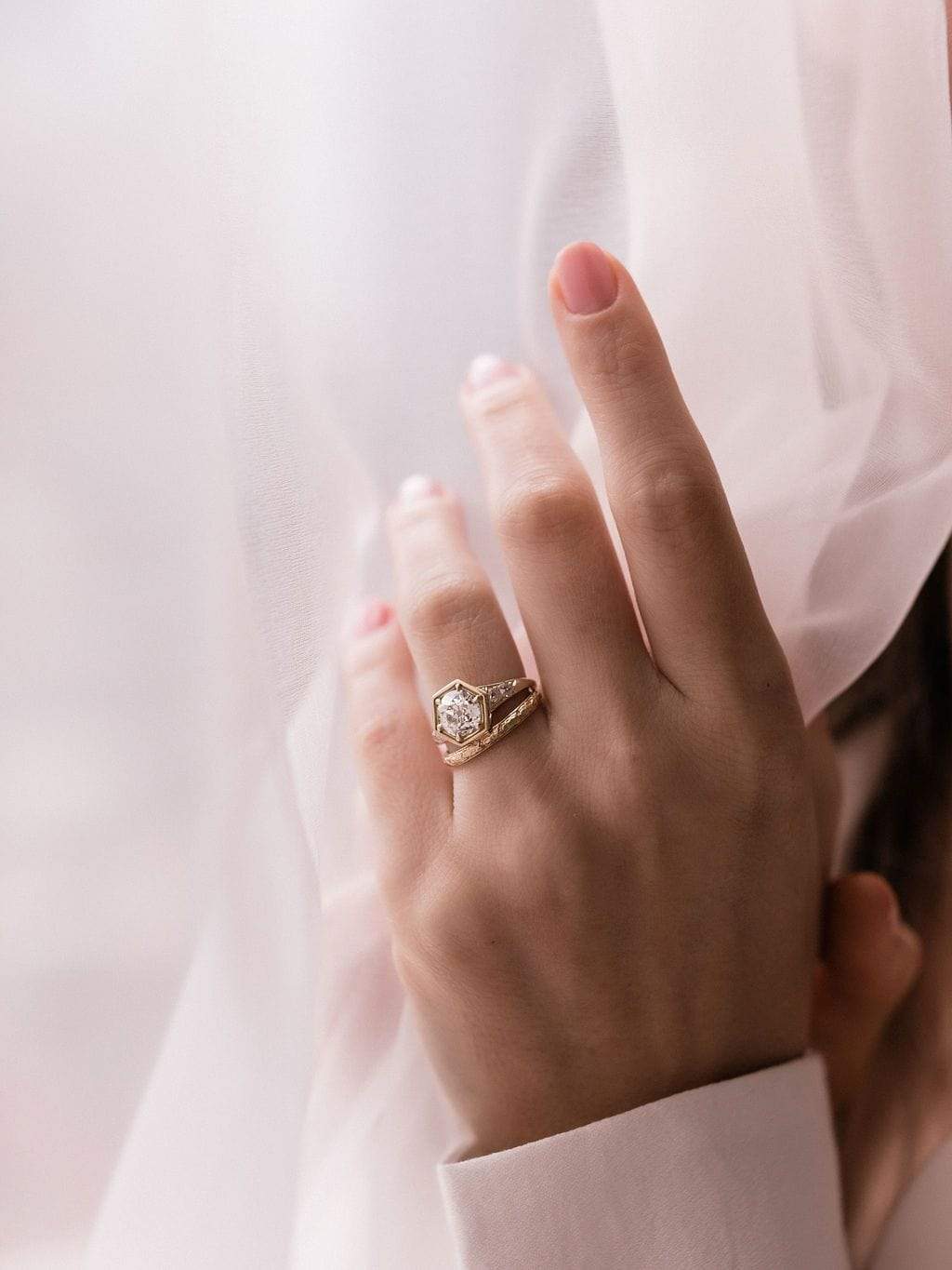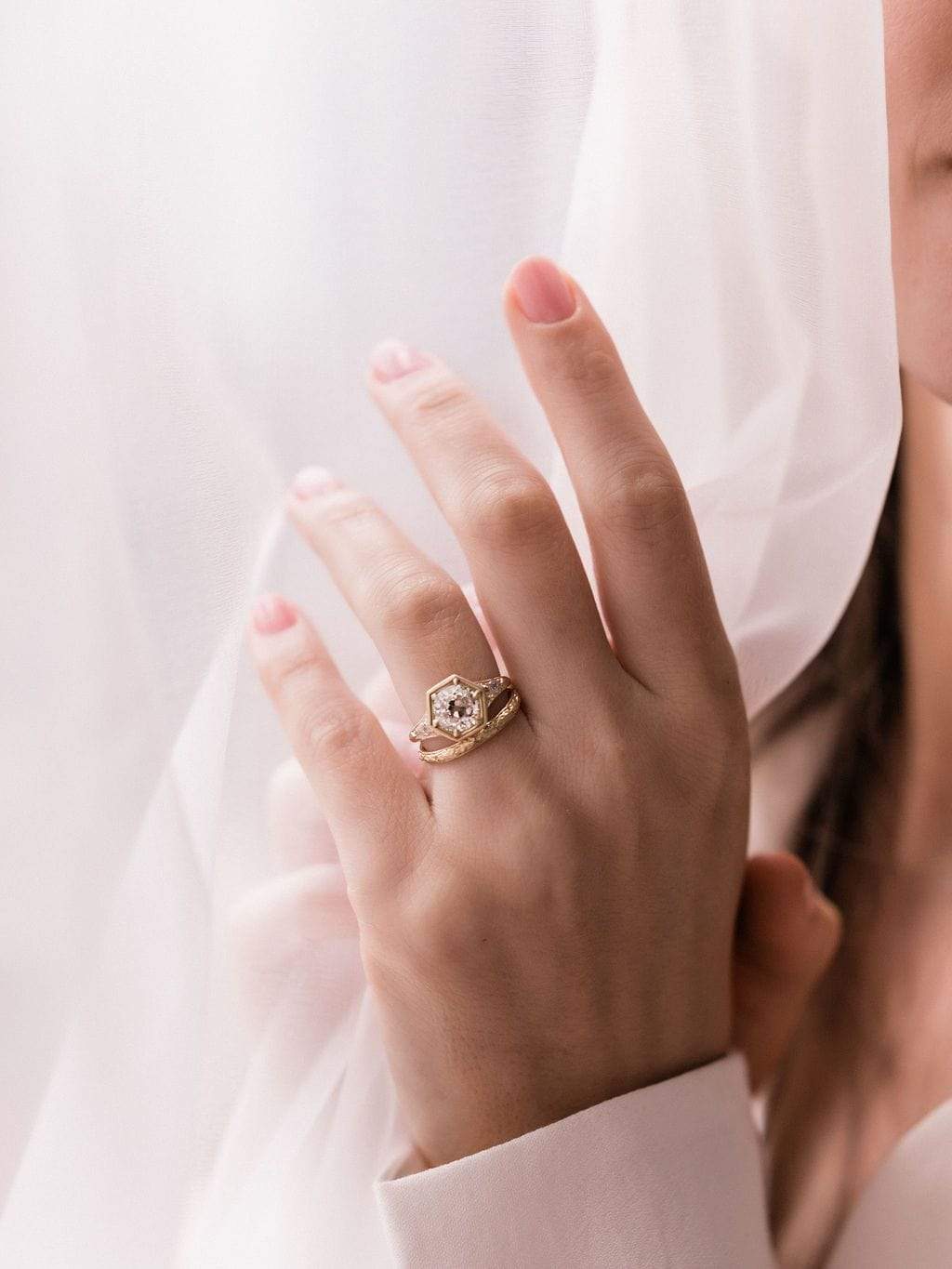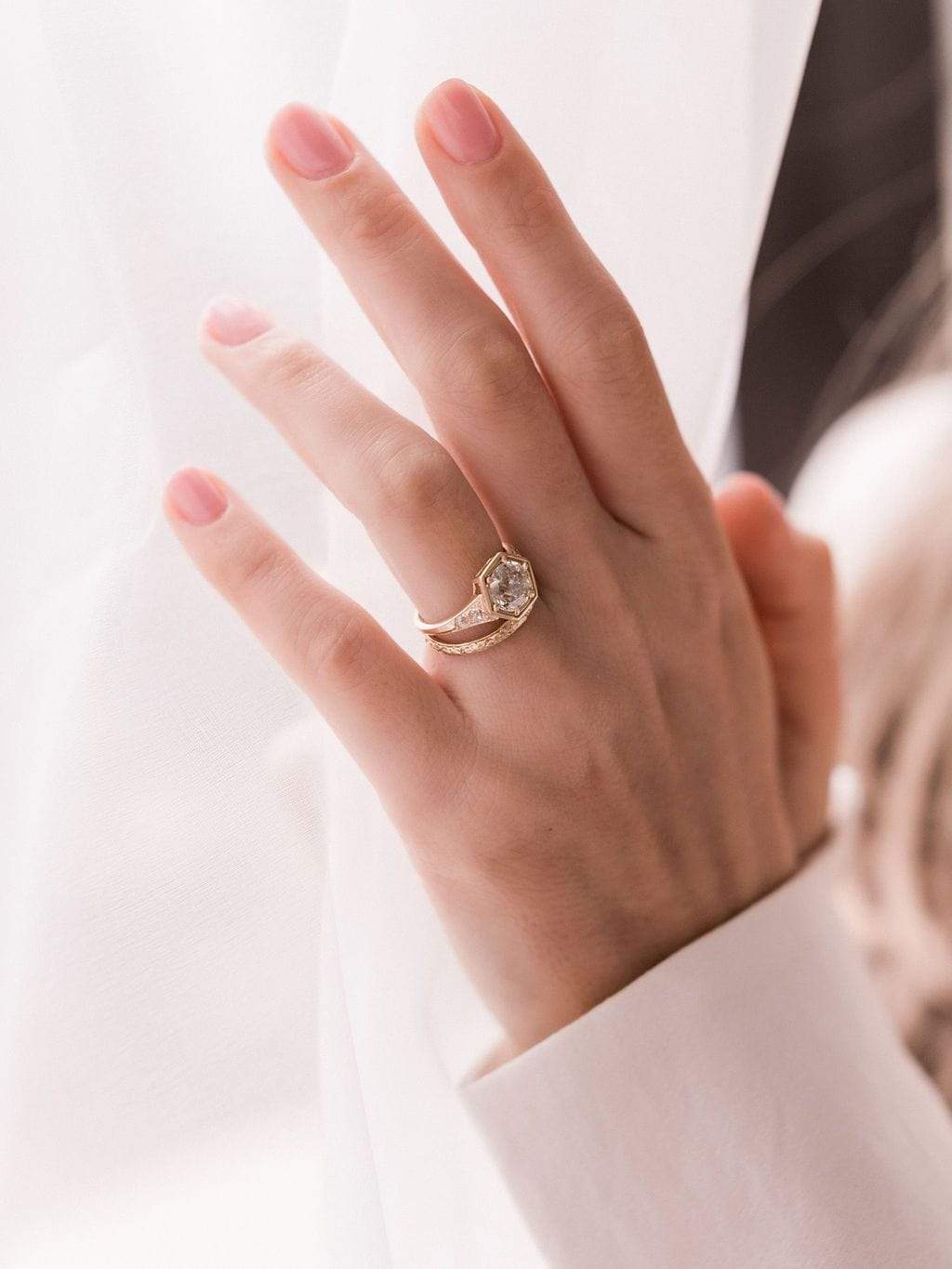 Very into that hex shape! The stones in this ring are super vibrant and bright and pop against the creamy yellow gold setting. Set super low for an easy wear and a definite unique look!