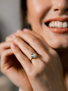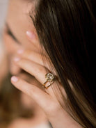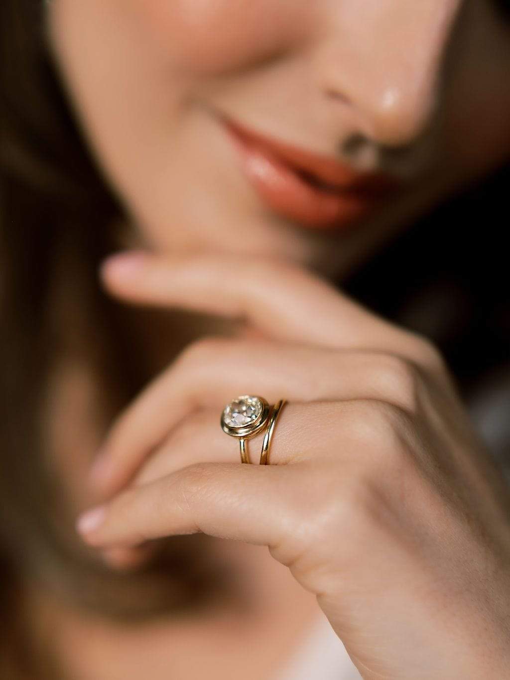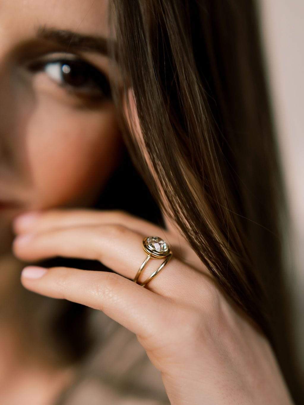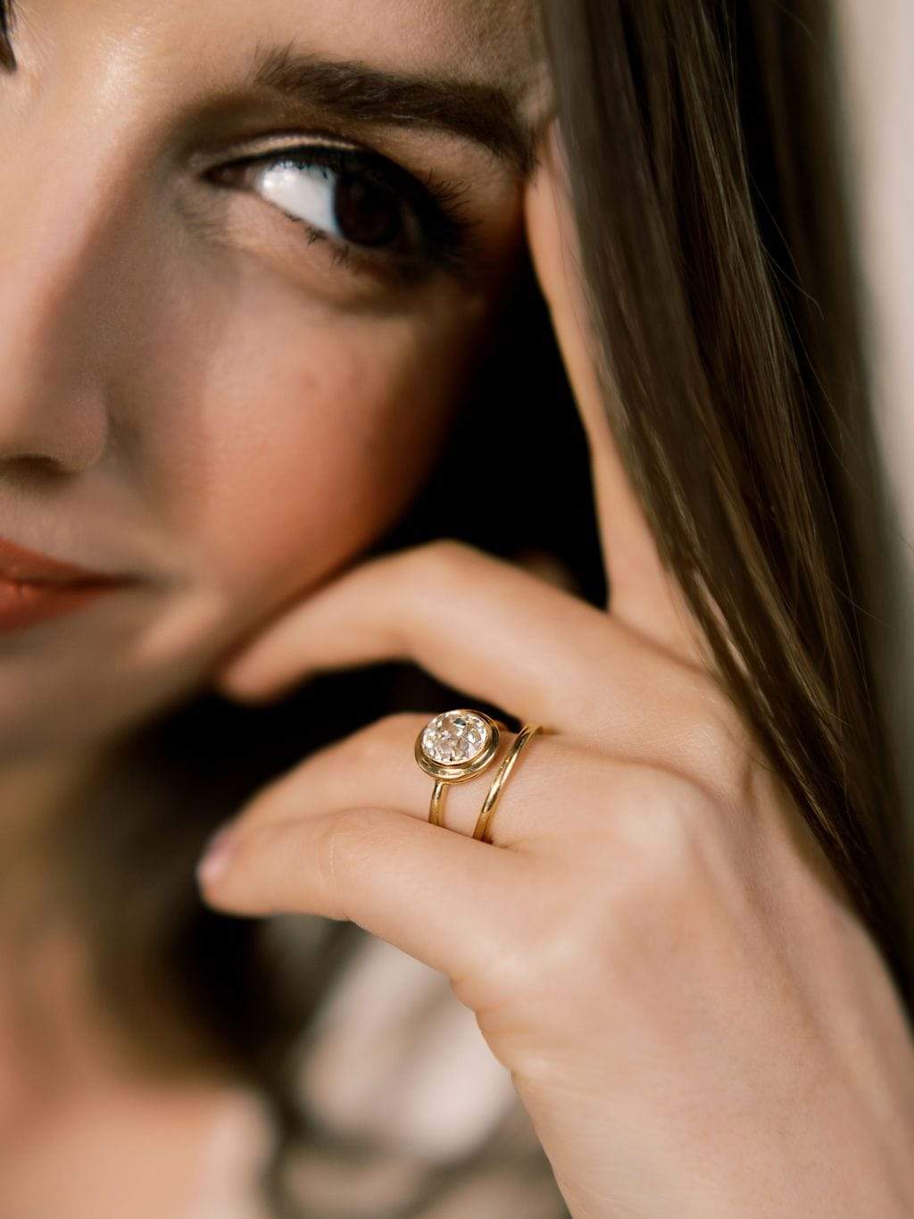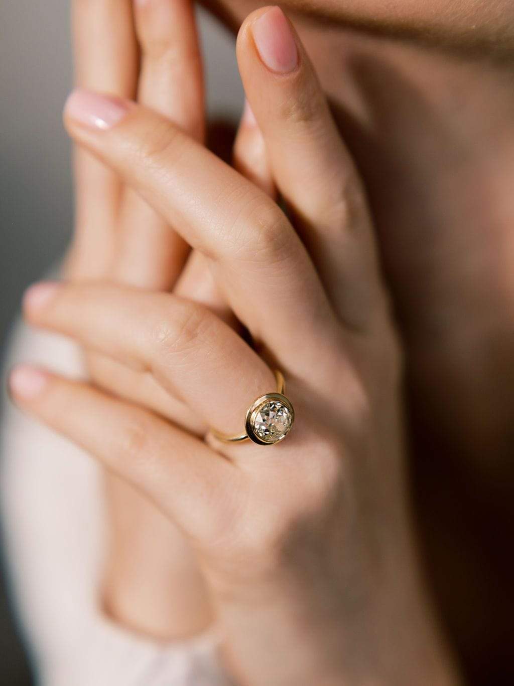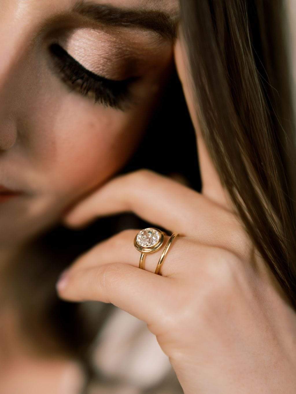 We love this sleek and chic piece with a bold golden halo and a dainty band around a beyond gorgeous old mine cut diamond!