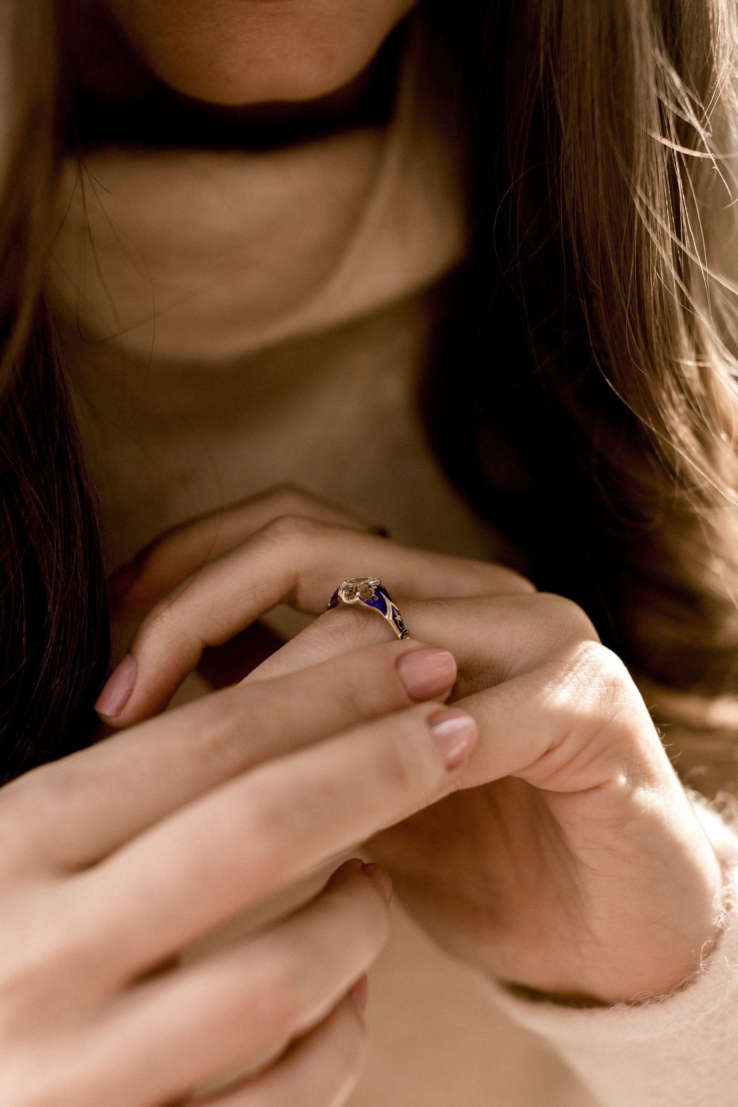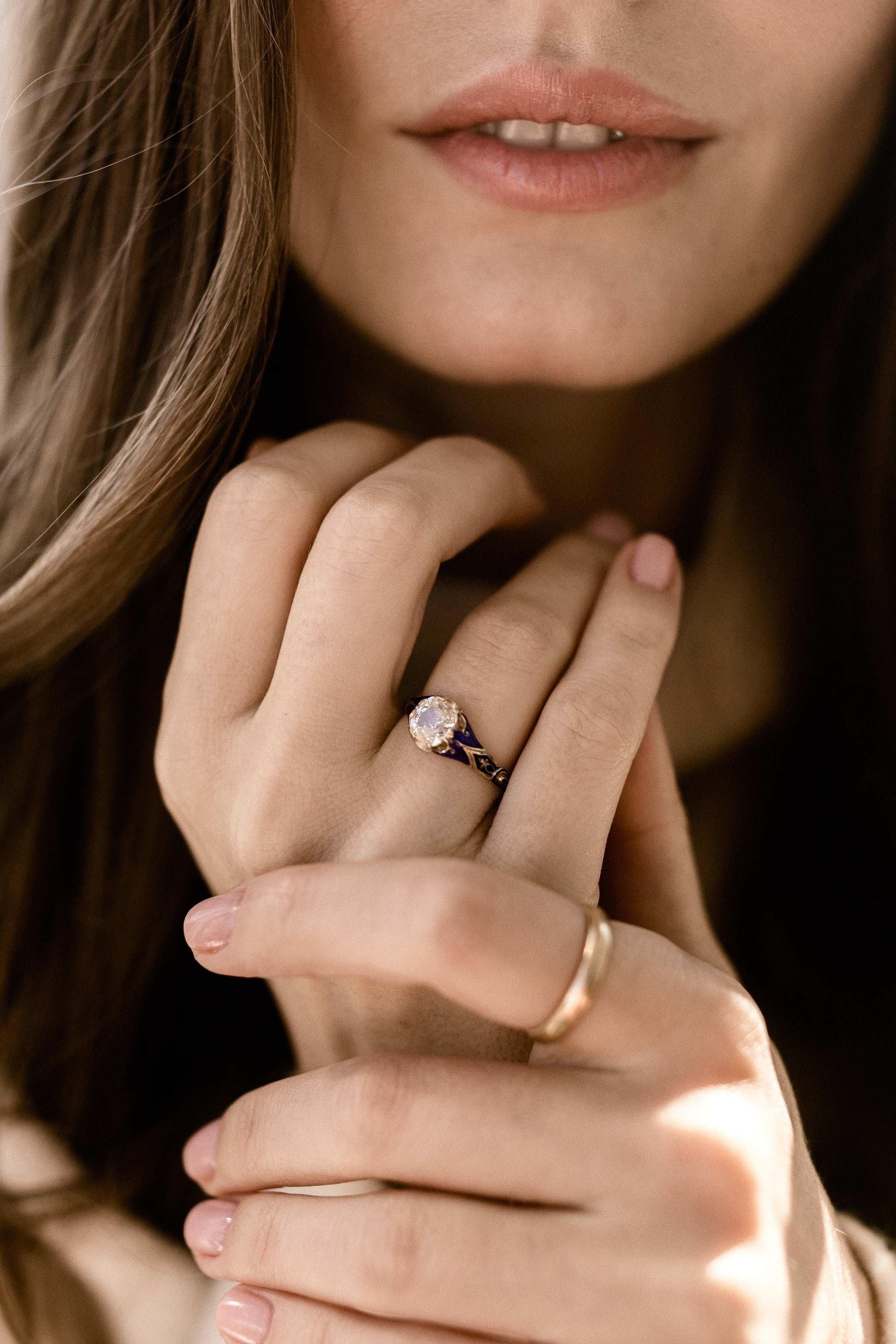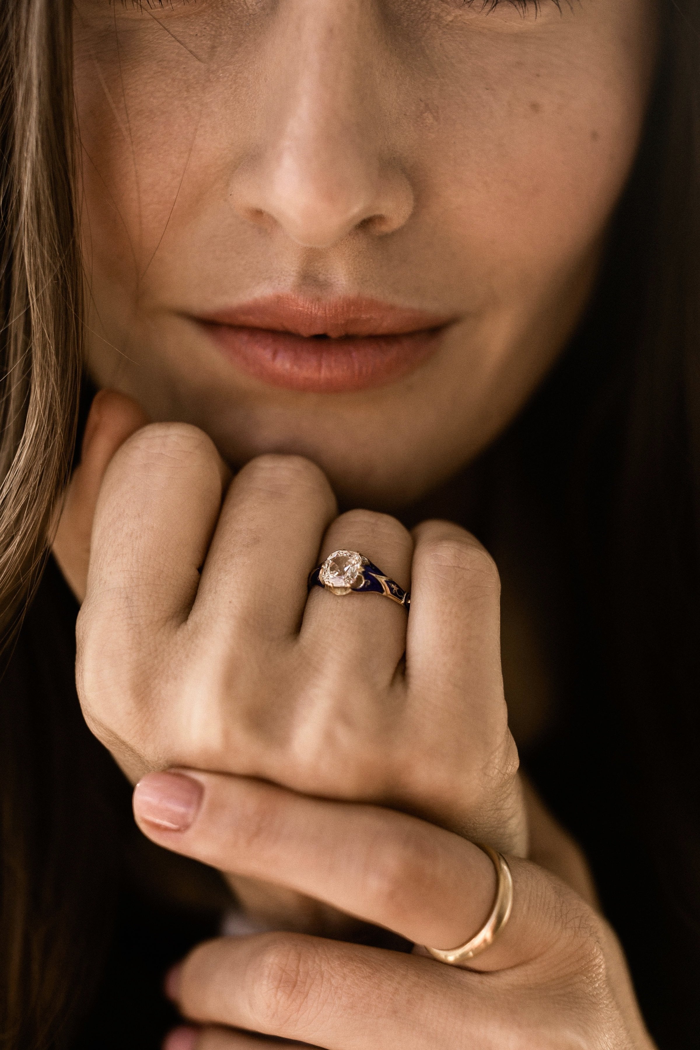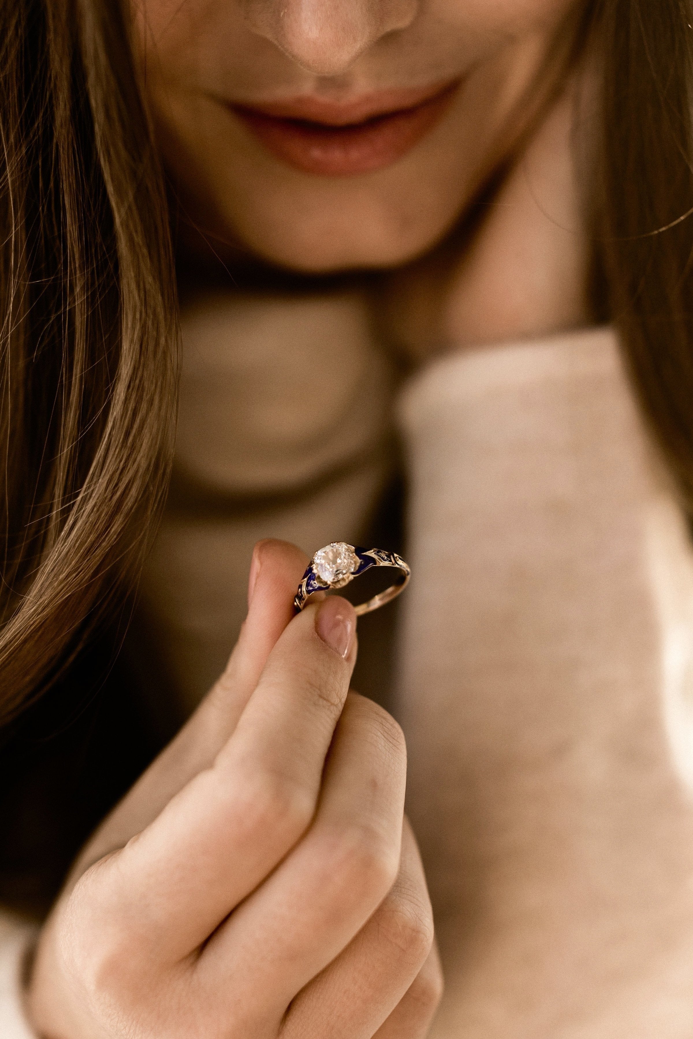 The Lucia Ring is a Victorian Ring circa 1890! This blue enamel engagement ring centers a GIA Certified 0.93 carat antique cushion diamond of G color, SI1 clarity. The diamond is prong-set in a 15kt yellow gold setting with lovely blue enamel details. The ring is size 9 and can be resized!