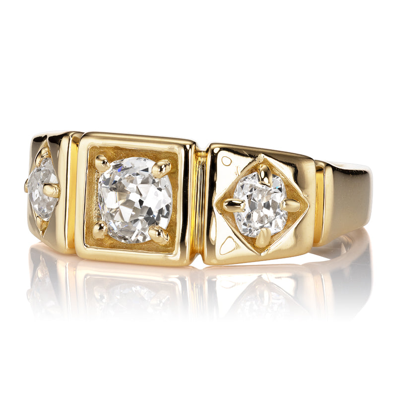Inspired by an Edwardian piece we once had in our collection, we created our own take on the original antique. The AB-made Helga ring was born! With three unique Old Mine Cut diamonds situated in uniquely oriented box-like settings, this ring has wonderful bold character. Wearable everyday with its super low-profile and comfortable buttery gold band. A fun look for any finger!