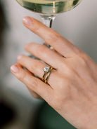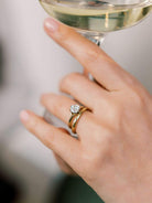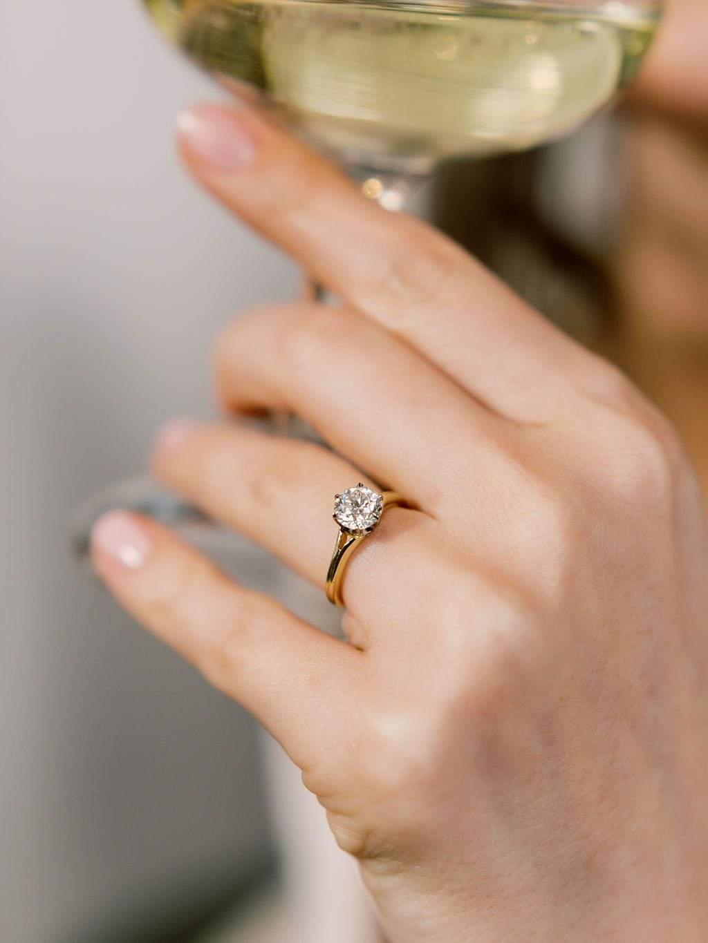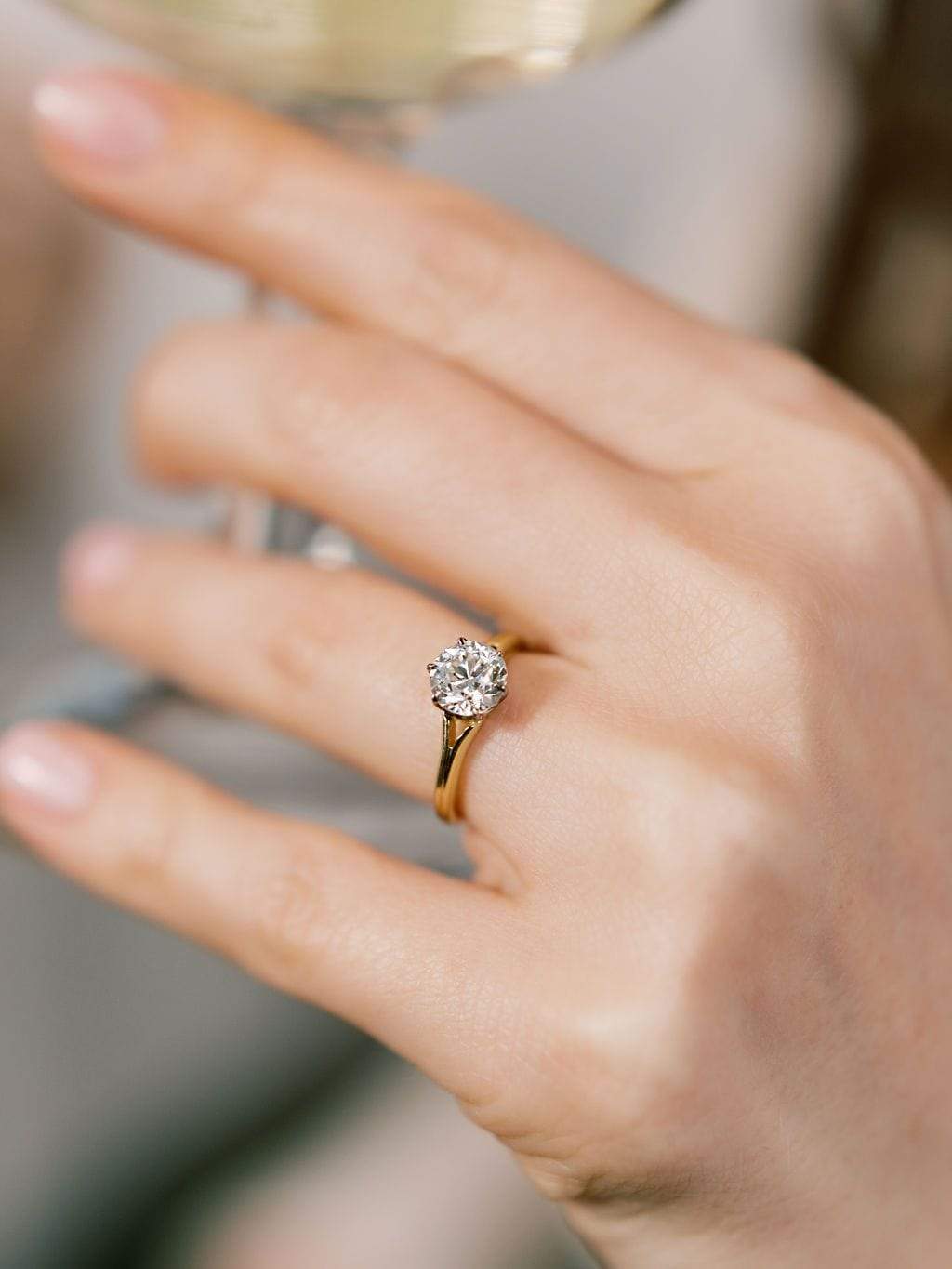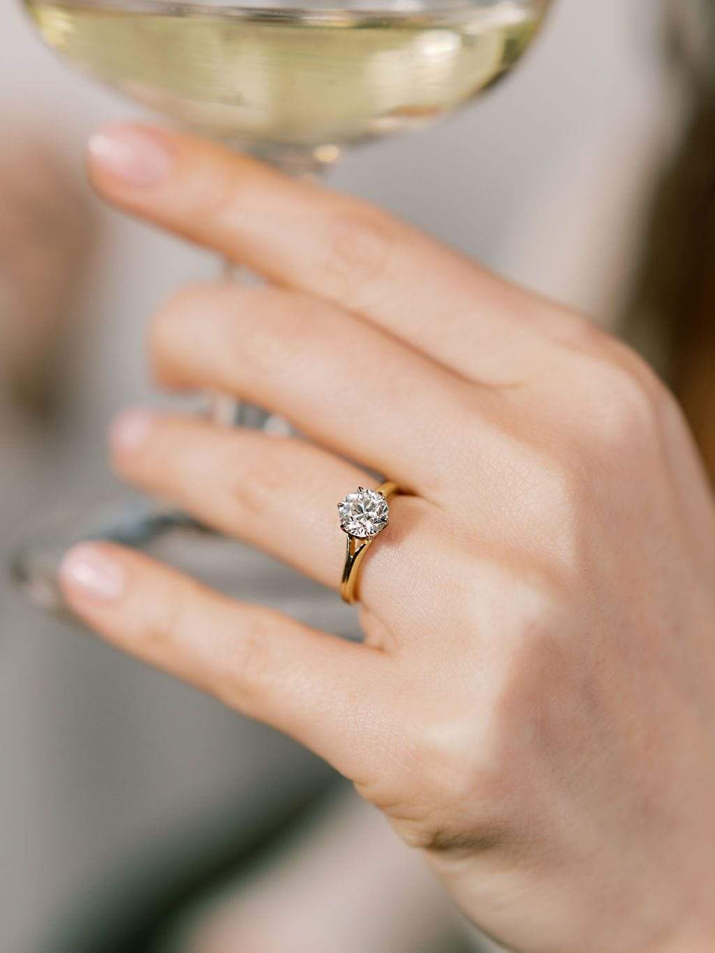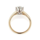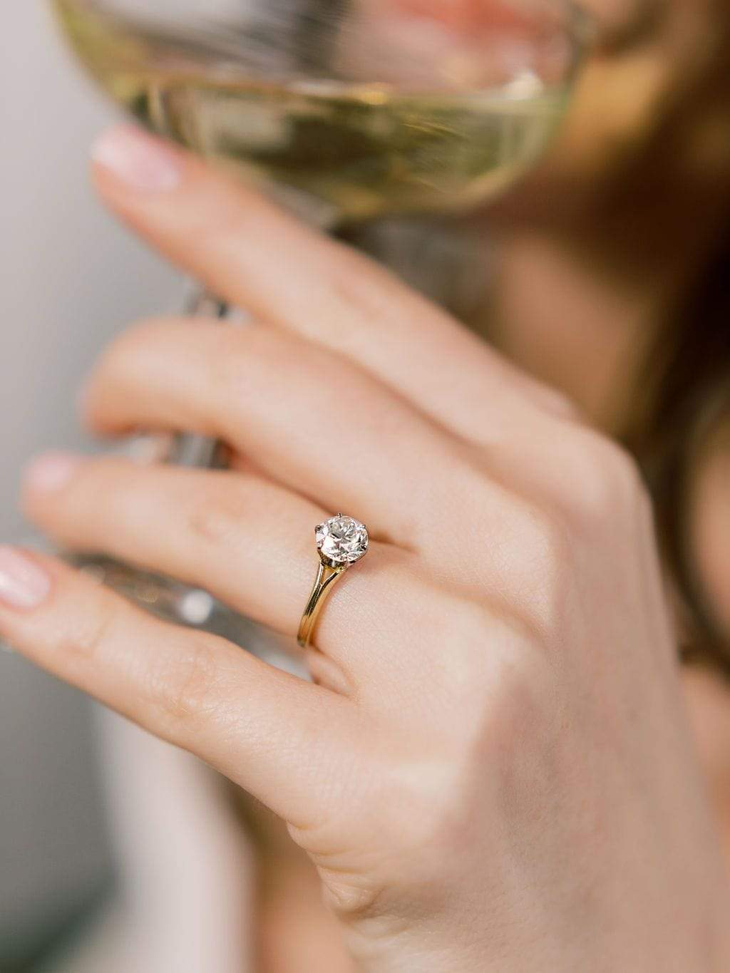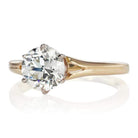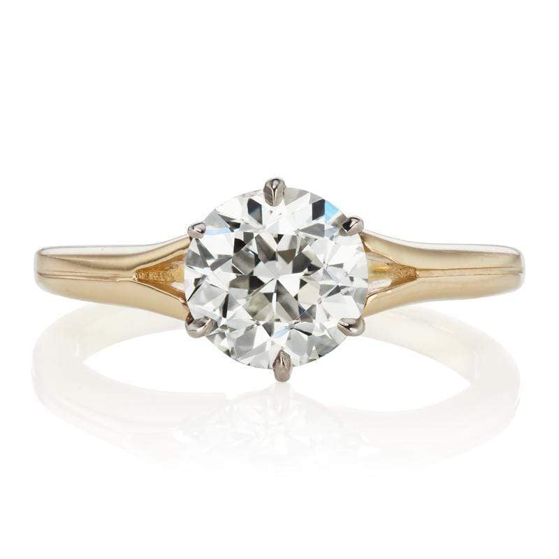 The Bridget ring is a vintage diamond engagement ring. The ring centers a GIA certified 1.20-carat old European cut diamond of J color, VS2 clarity. The stone is set in a 6-prong platinum setting on an 18 karat yellow gold split-shank band. The ring is currently size 4.25 and can be resized!