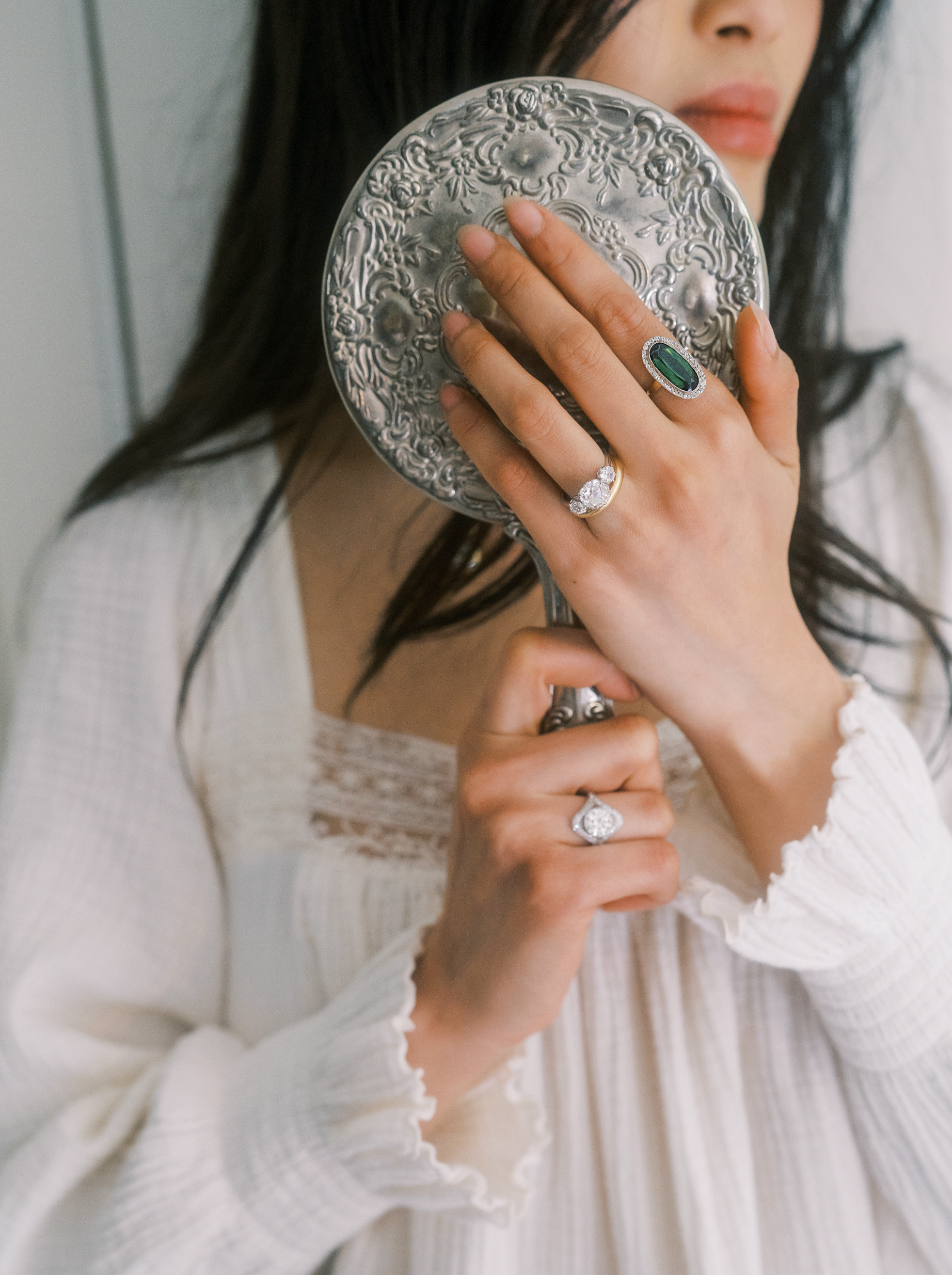 The most stunning, bright white antique diamond with a dream cushiony shape centers this crisp Marielle. This piece glitters and catches the eye from far across the room.