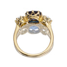 The Mallory 1.90 ring is an AB original design made right here in NYC. The ring centers a C. Dunaigre-certified 1.90-carat Heated Cushion Cut Ceylon sapphire. On either side of the sapphire is an Old European Cut diamond, together totaling 0.74 carats. The stones are set in our signature 18kt yellow gold. The ring is currently size 5 and can be resized!